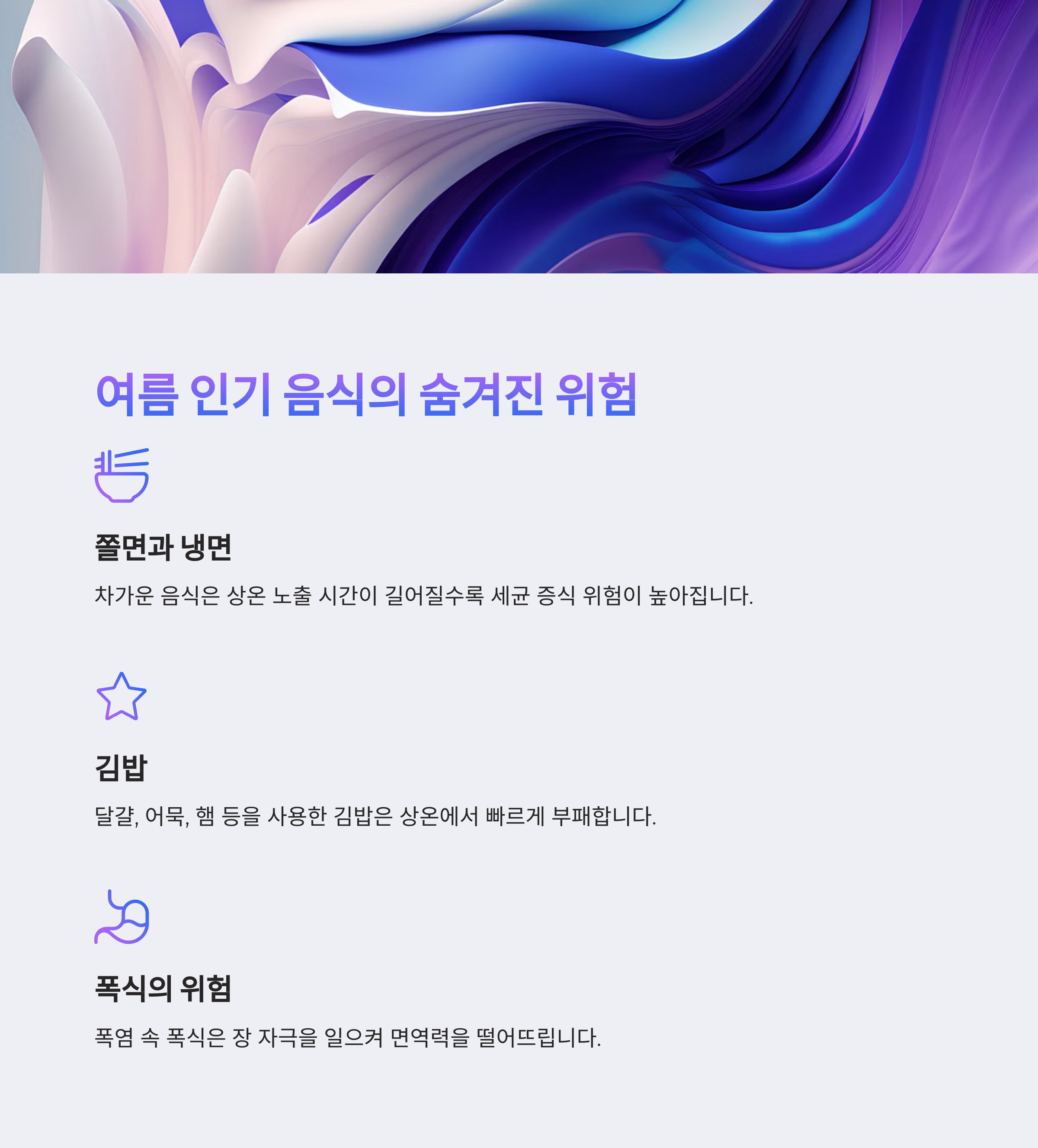 특히 무더위 속에서 냉면, 김밥, 쫄면 등 차가운 음식 섭취 시 보관과 위생을 철저히 관리하고, 이상 증상이 있을 경우 빠르게 의료기관을 찾는 것이 중요합니다.