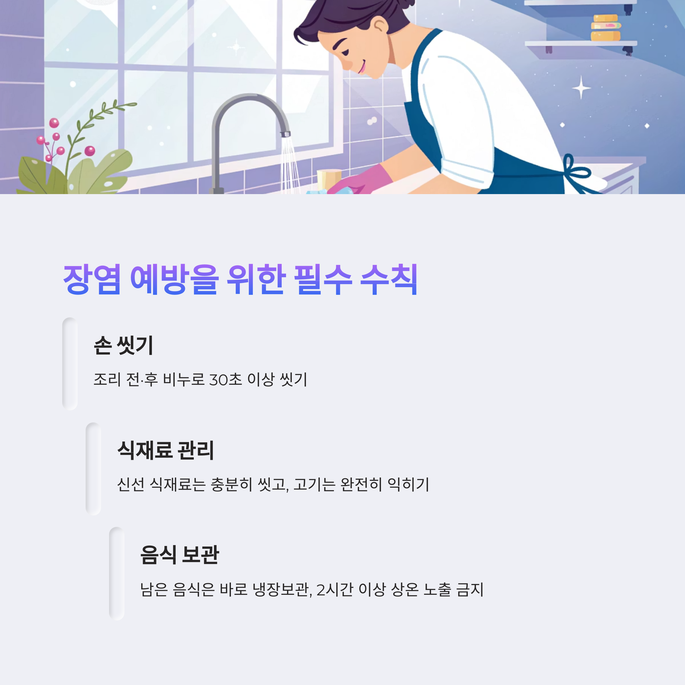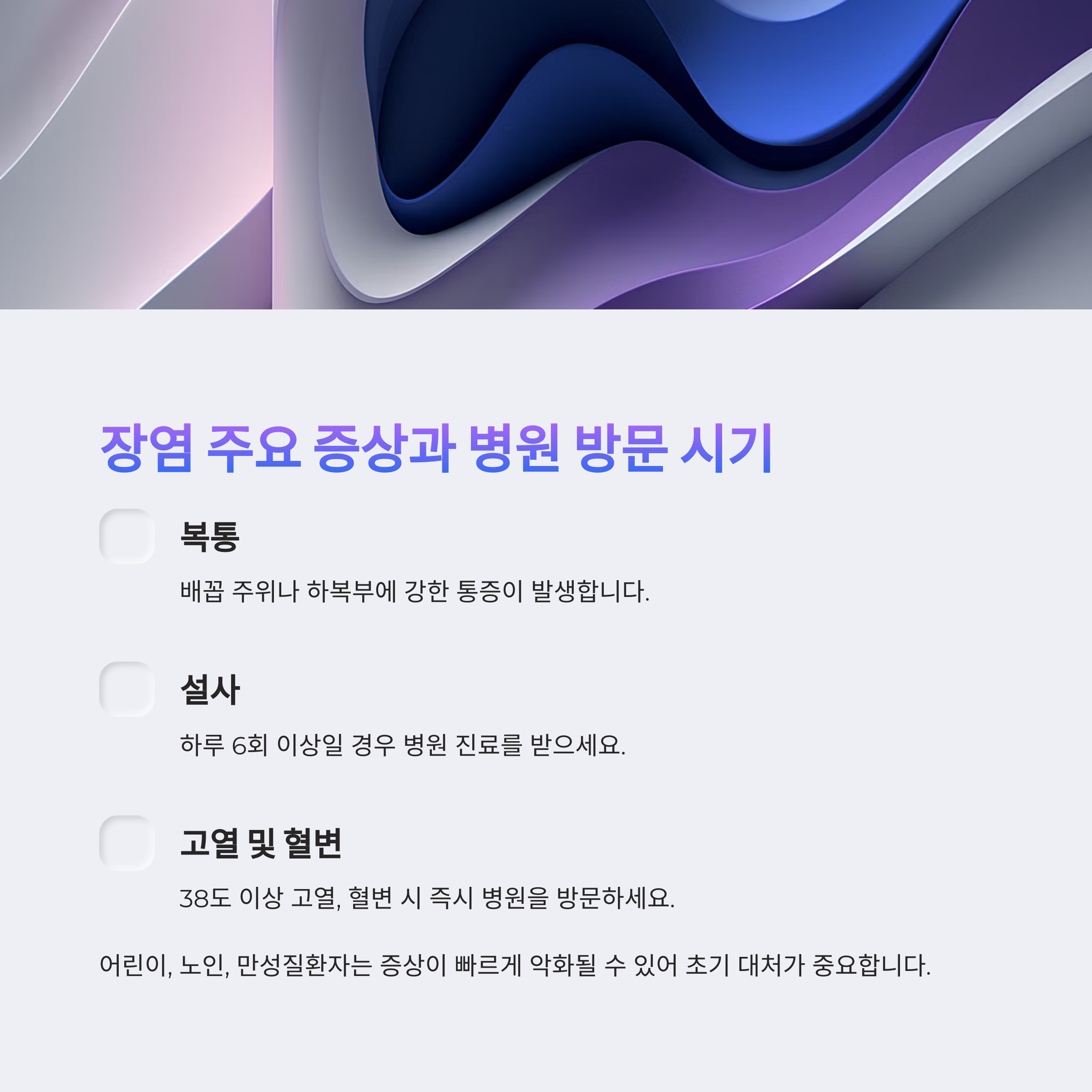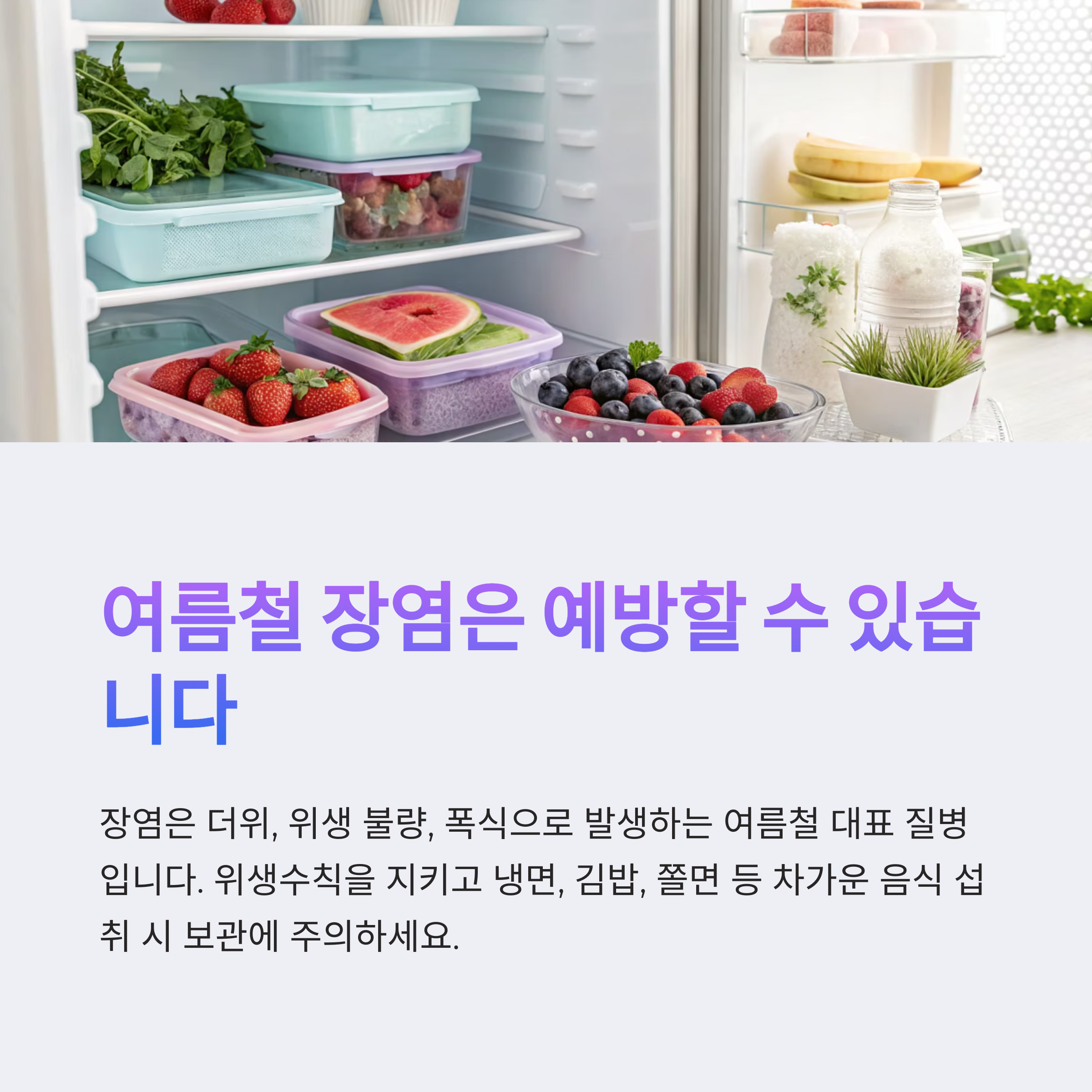 여름철 장염은 일반인도 주의가 필요하지만, 특히 면역력이 약한 고령자, 영유아, 당뇨나 암환자 등 만성질환자는 더욱 취약합니다.