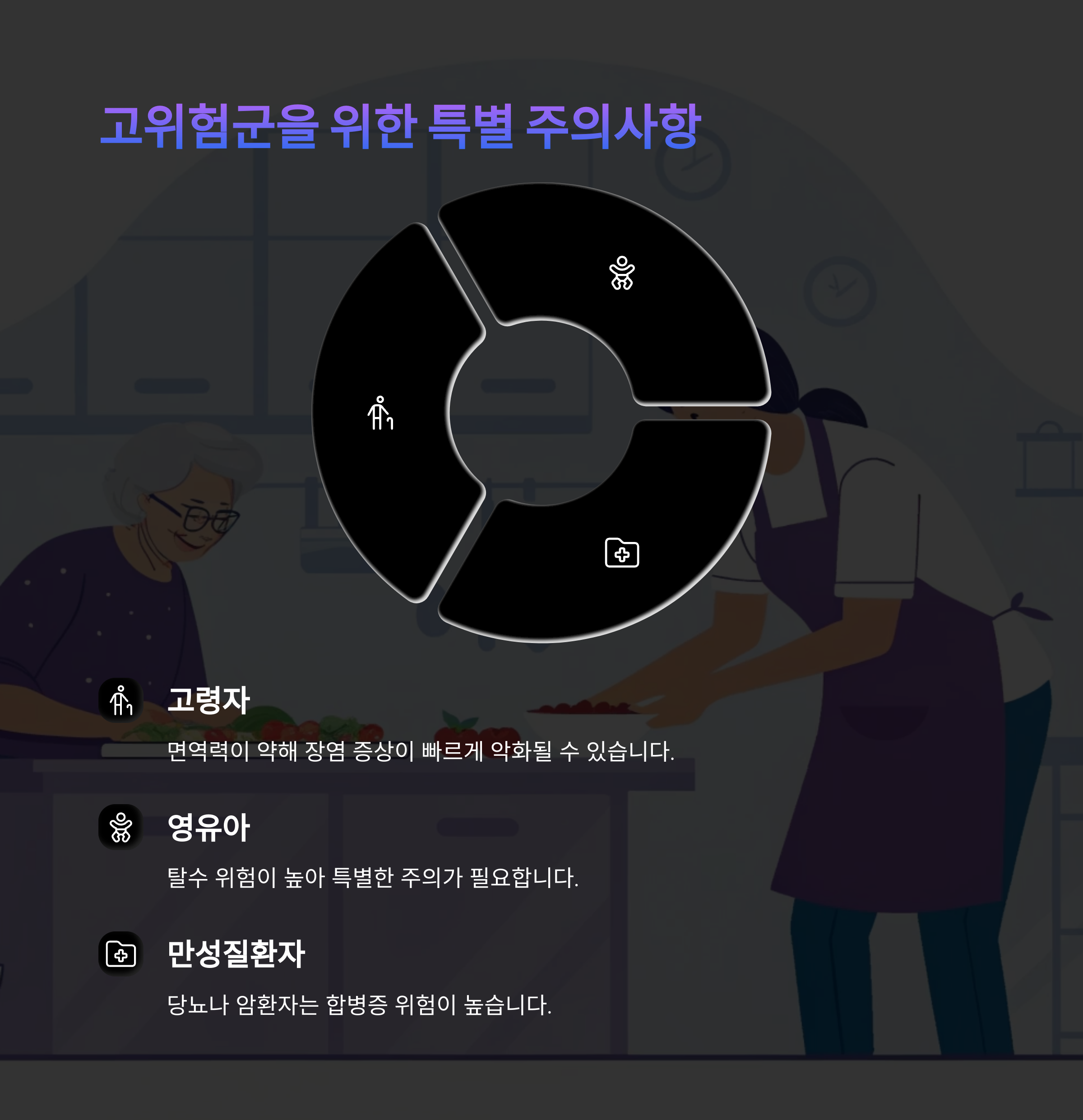 이들은 장염 증상이 빠르게 악화되거나 합병증으로 이어질 가능성이 높기 때문에 음식 보관과 위생에 각별히 신경 써야 합니다.
