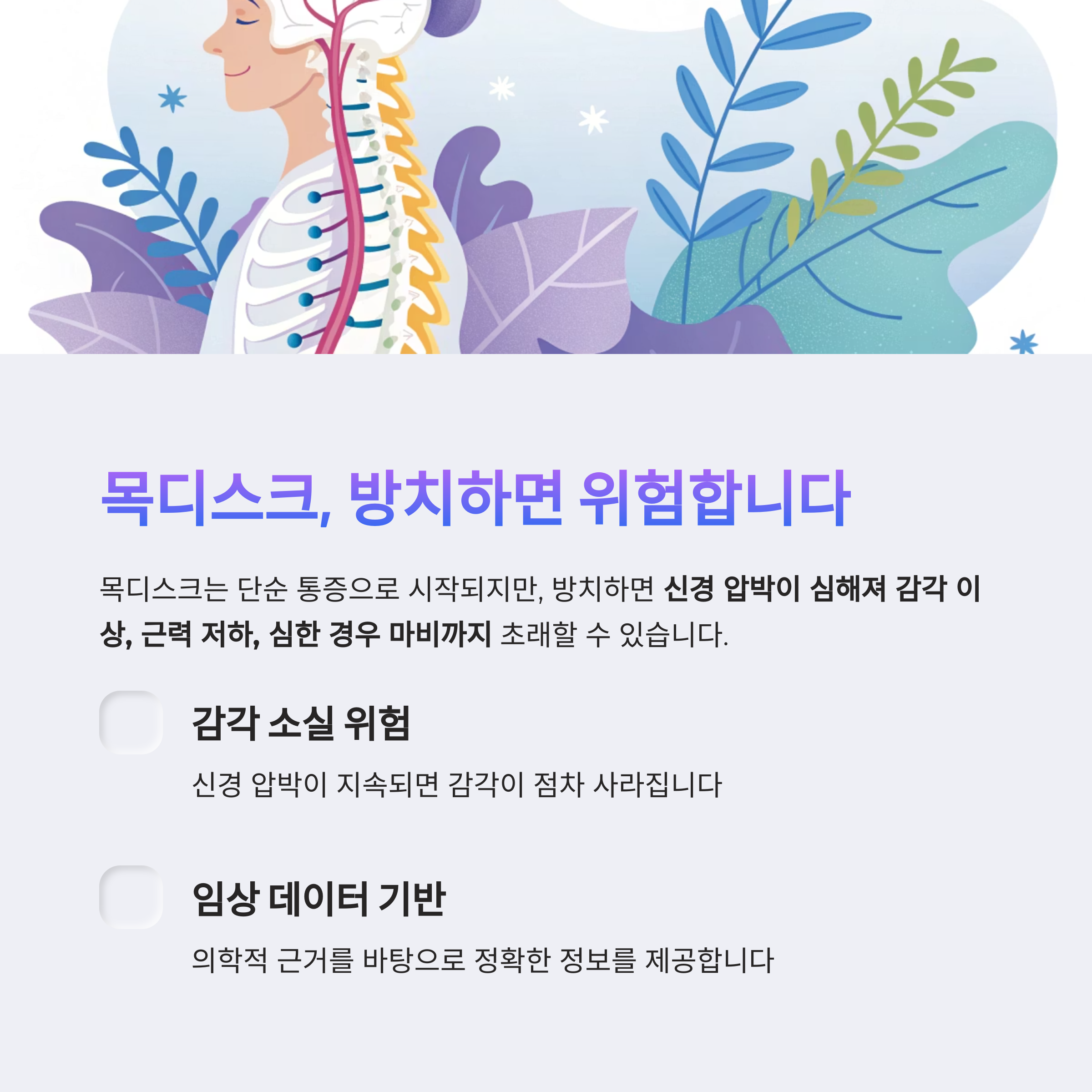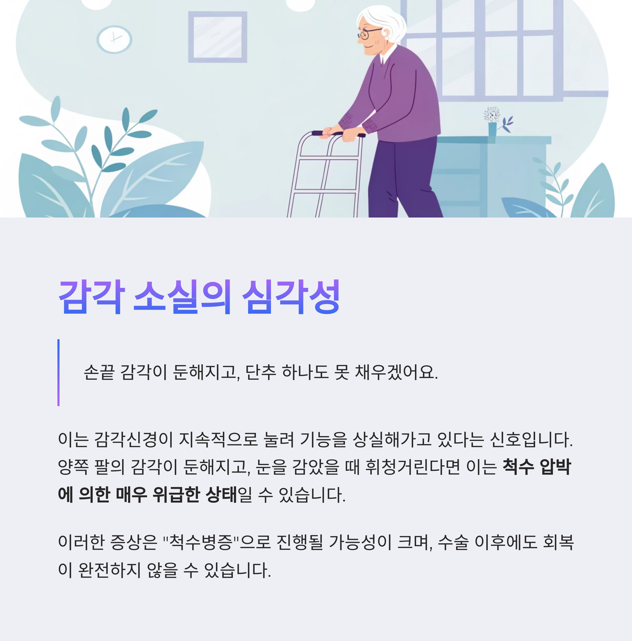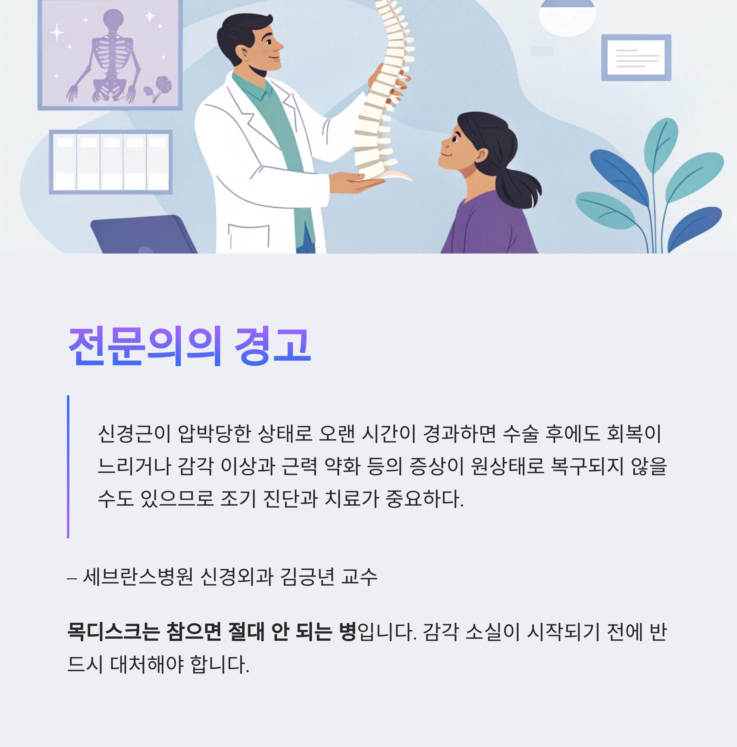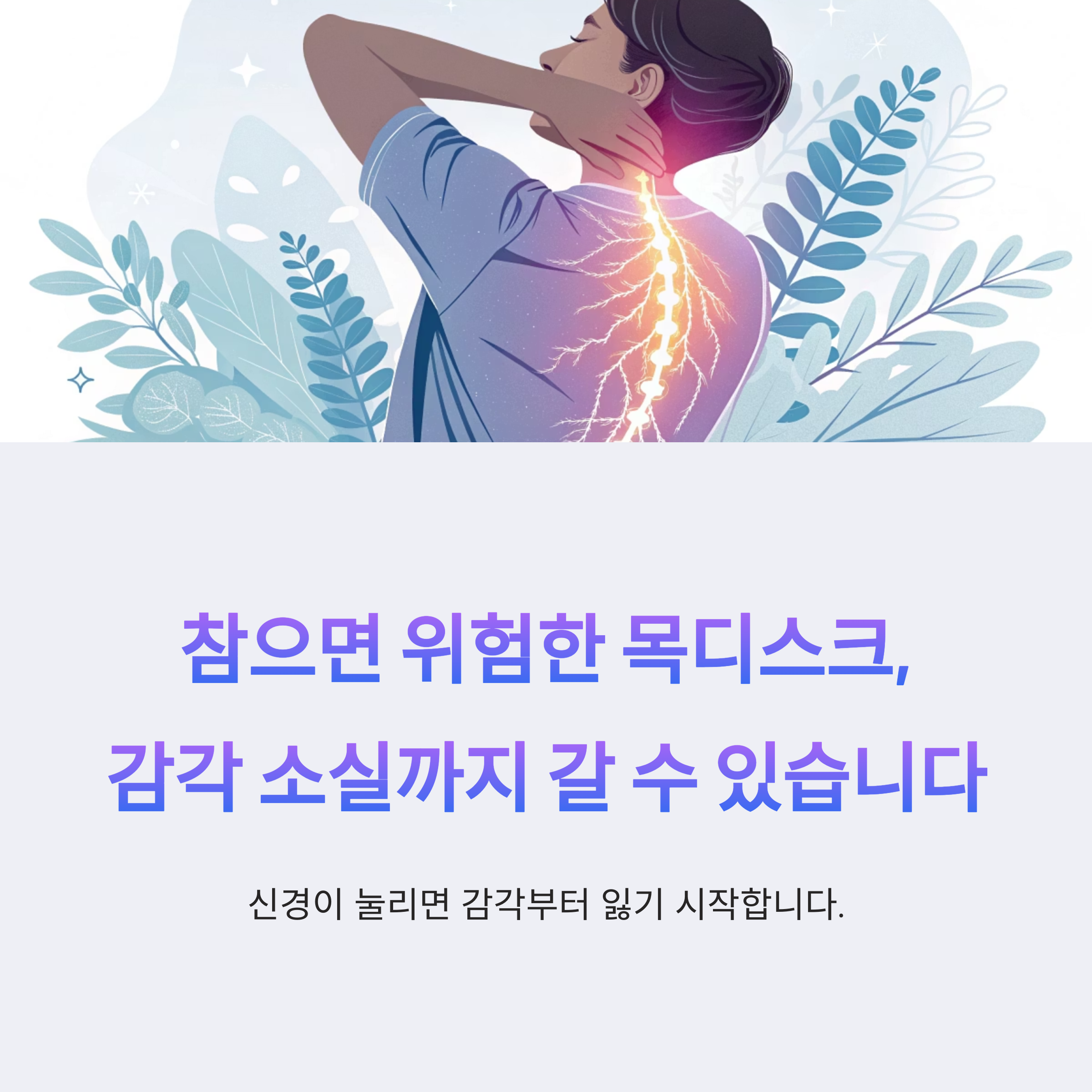 단순 통증이라며 참다가는 감각 소실, 근력 저하, 마비 등으로 일상생활 자체가 불가능해질 수 있습니다.