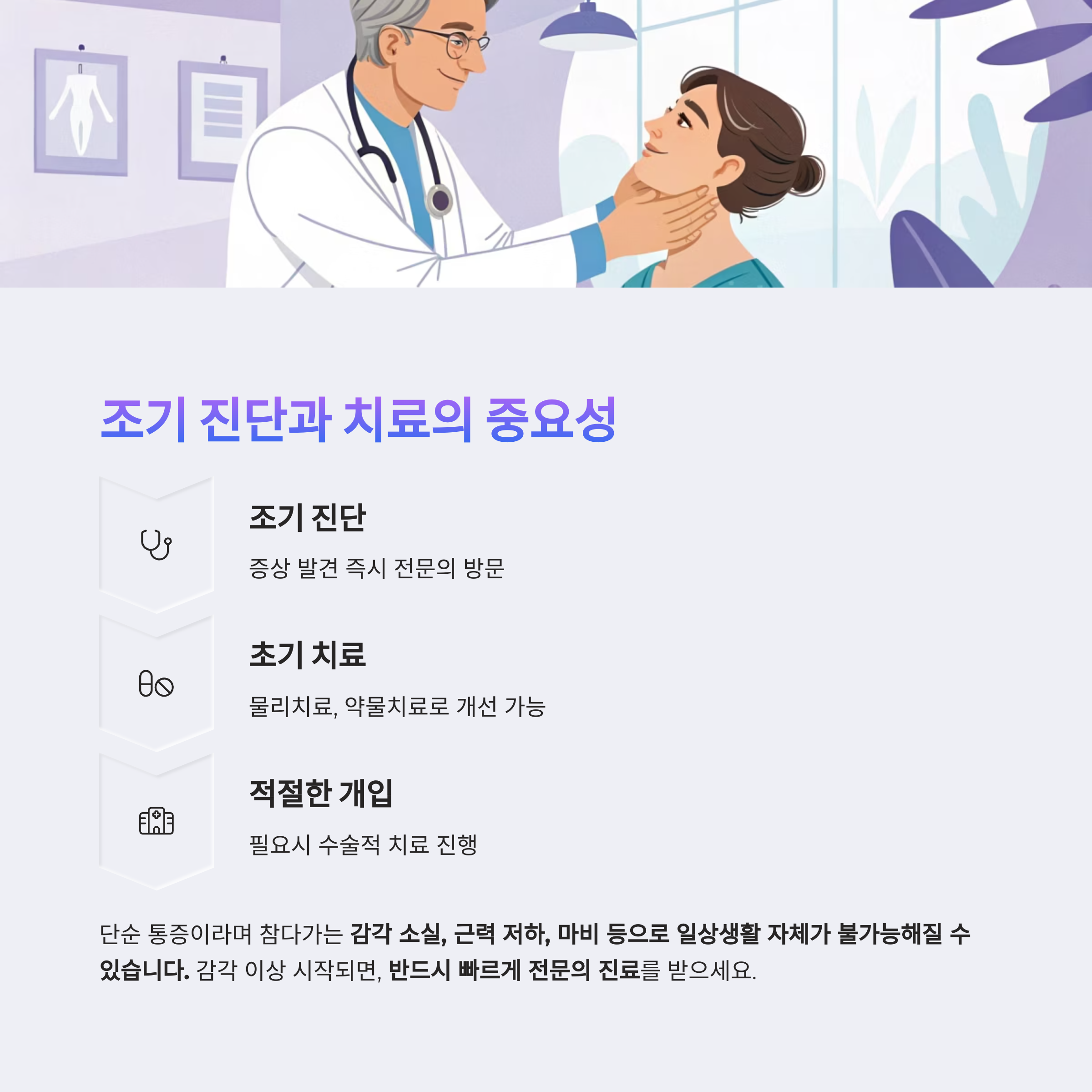 증상이 원상태로 복구되지 않을 수도 있으므로 조기 진단과 치료가 중요하다."