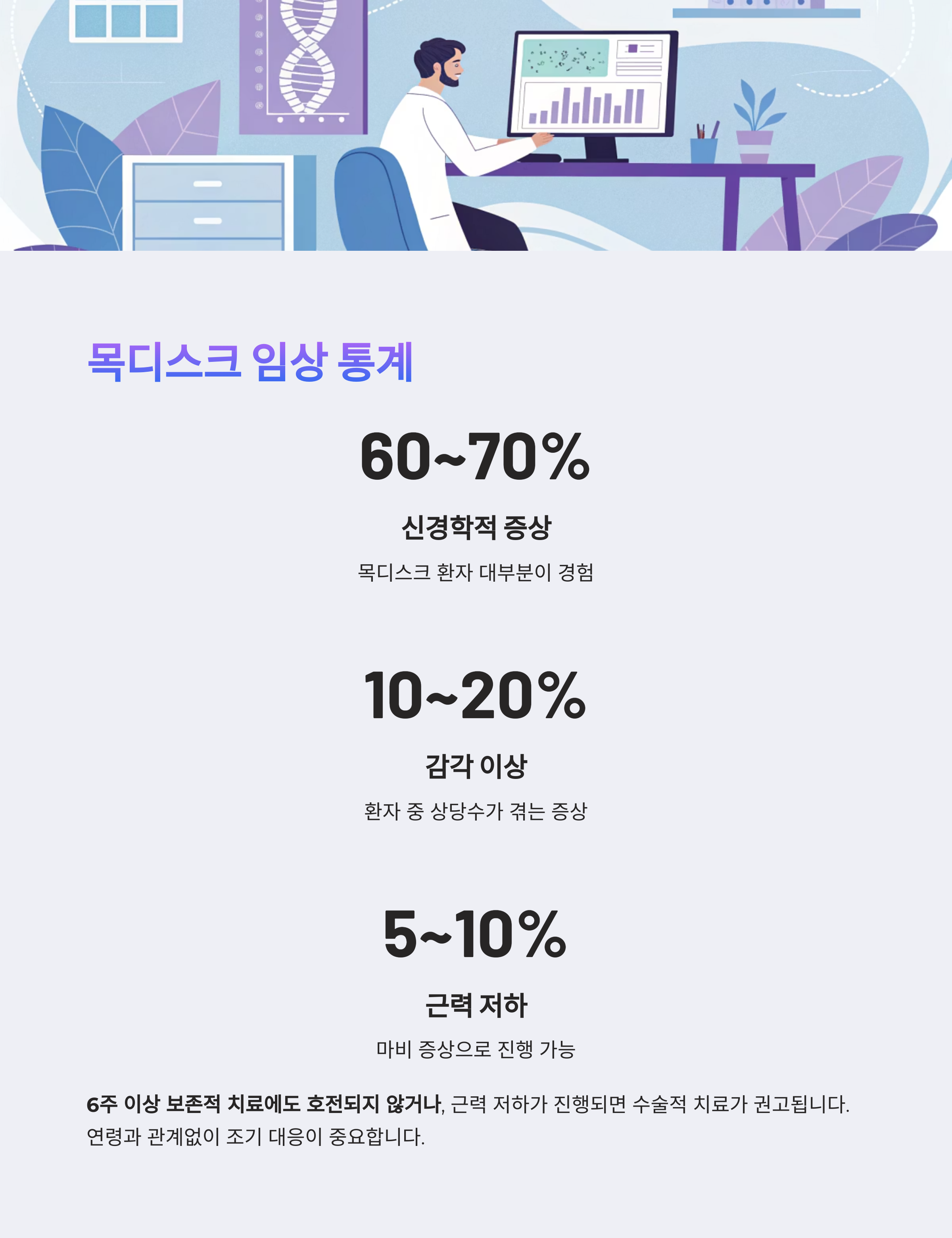 임상 자료에 따르면 목디스크 환자의 약 60% 에서 70%가 신경학적 증상을 동반하며, 이 중 10% 에서 20%는 감각이상,