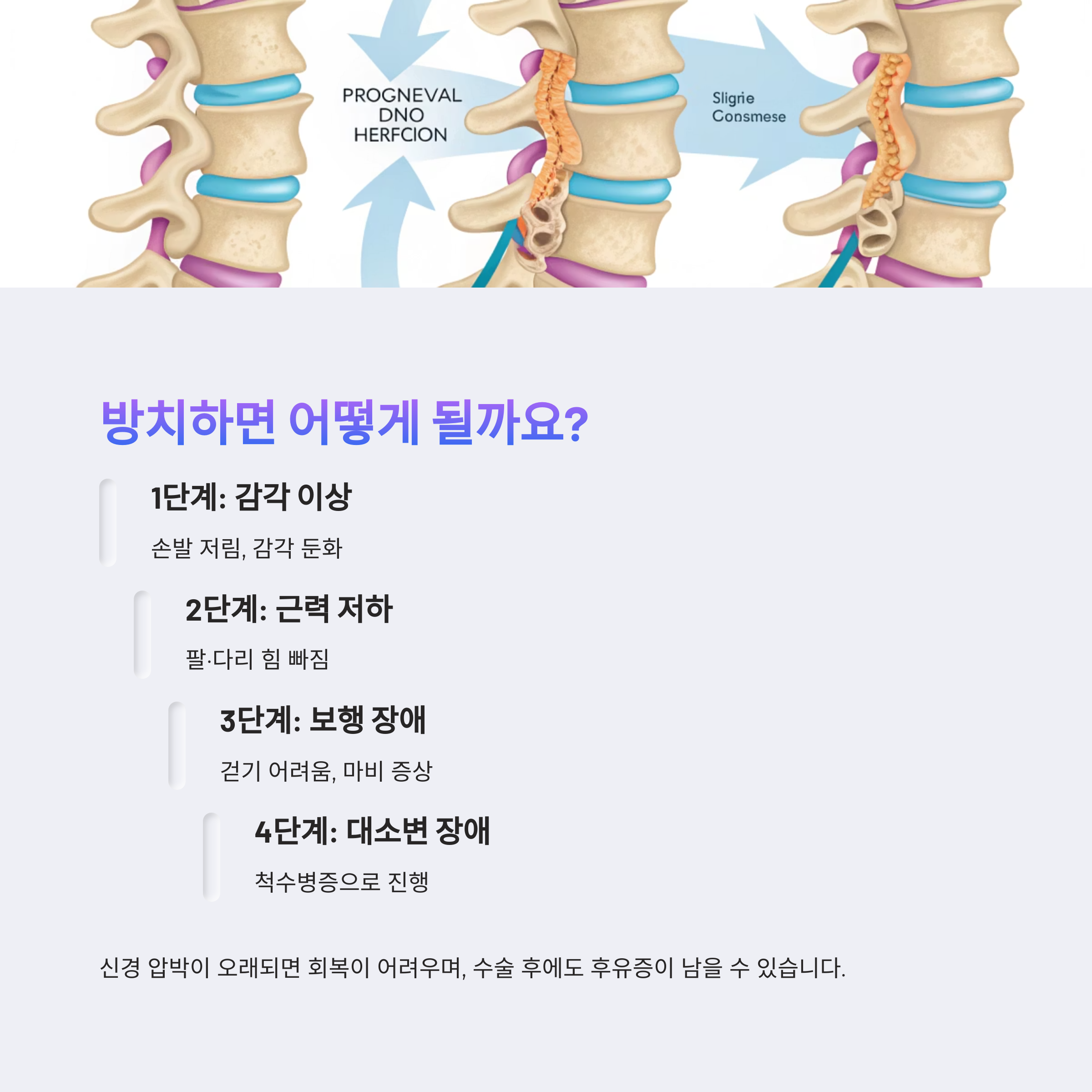 이러한 증상은 "척수병증"으로 진행될 가능성이 크며, 수술 이후에도 회복이 완전하지 않을 수 있습니다.