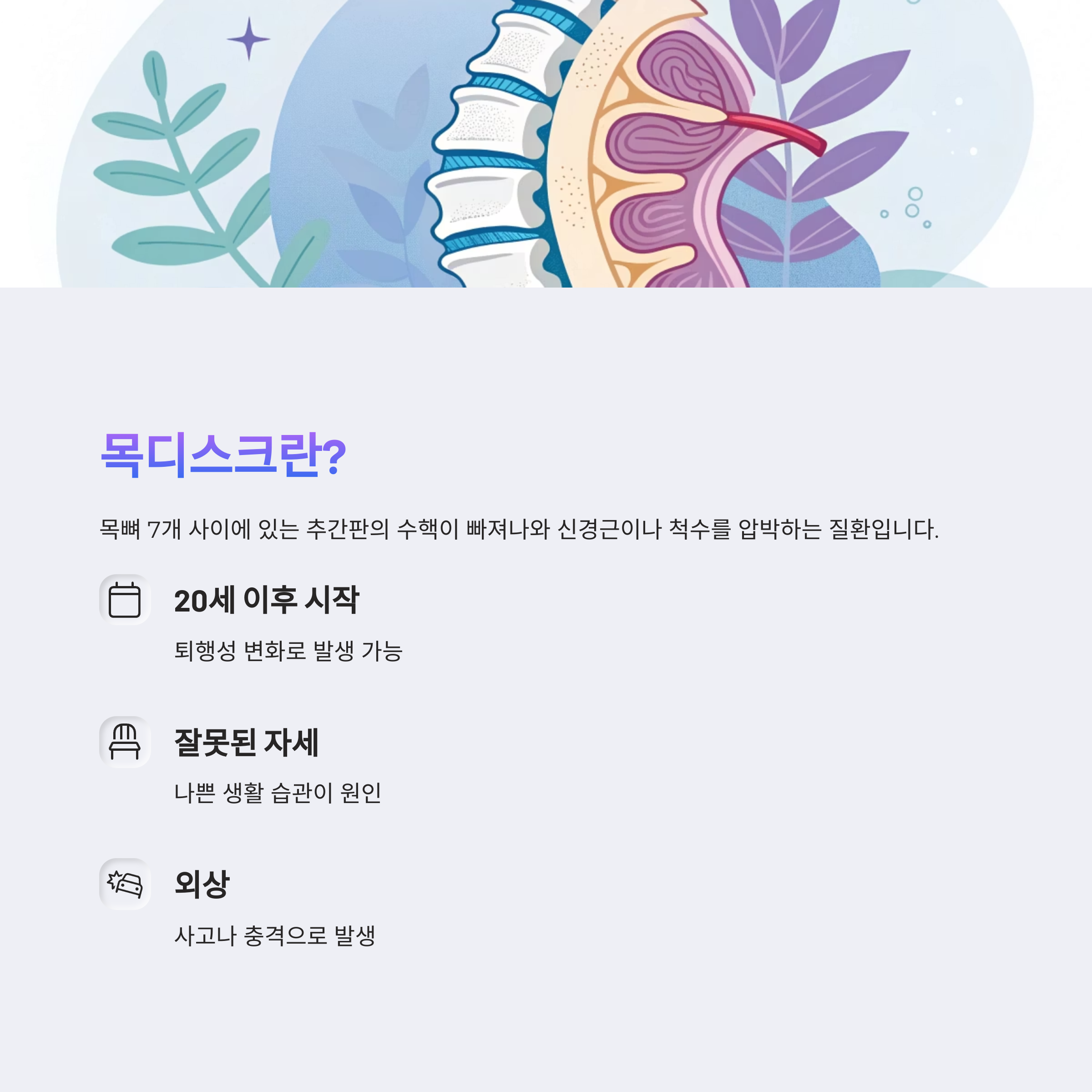 20세 이후 시작되는 퇴행성 변화나 잘못된 자세, 생활 습관, 외상 등이 주요 원인입니다.