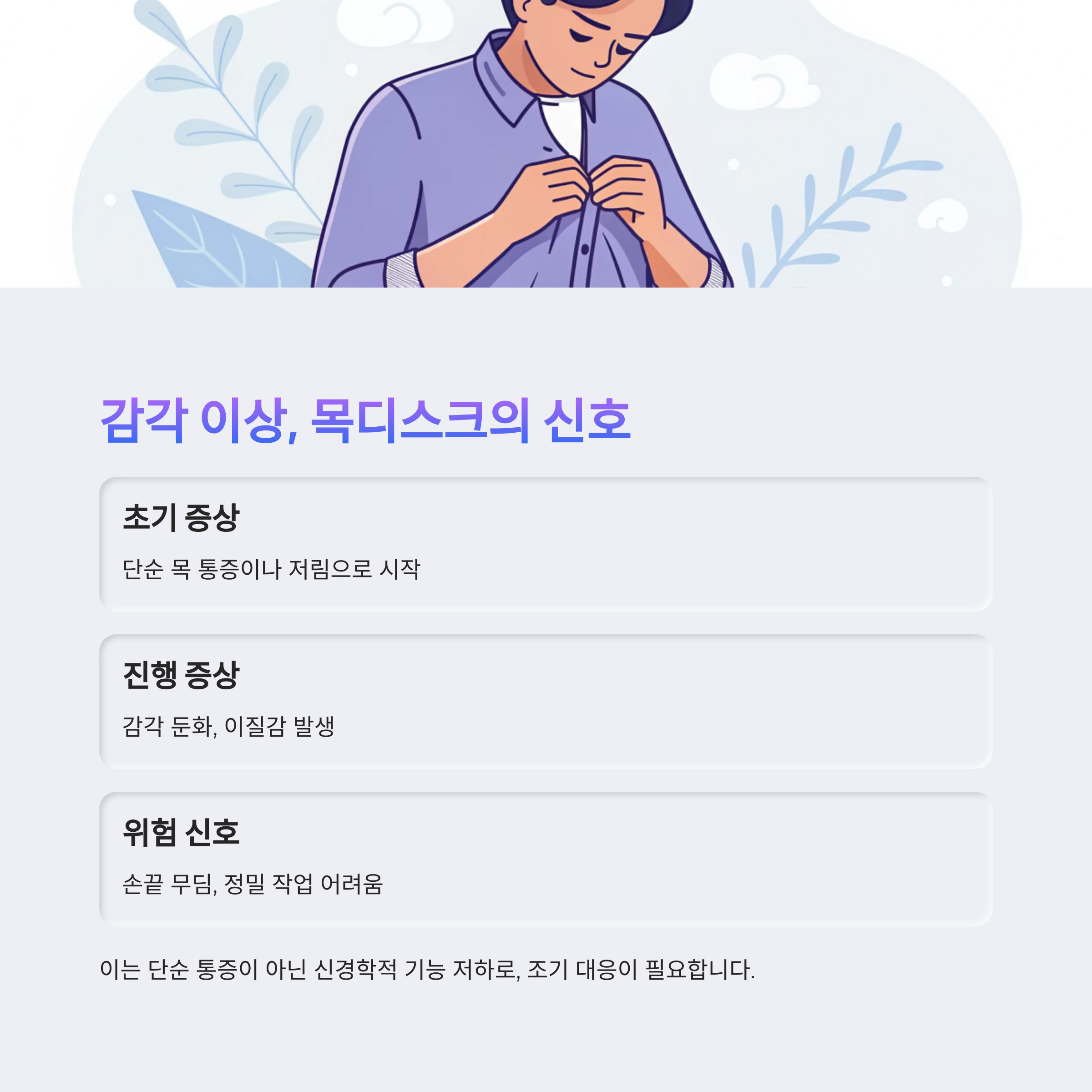 초기에는 단순 목 통증이나 저림으로 시작하지만, 시간이 지나면서 감각이 둔해지거나 남의 살을 만지는 듯한 이질감이 나타납니다.