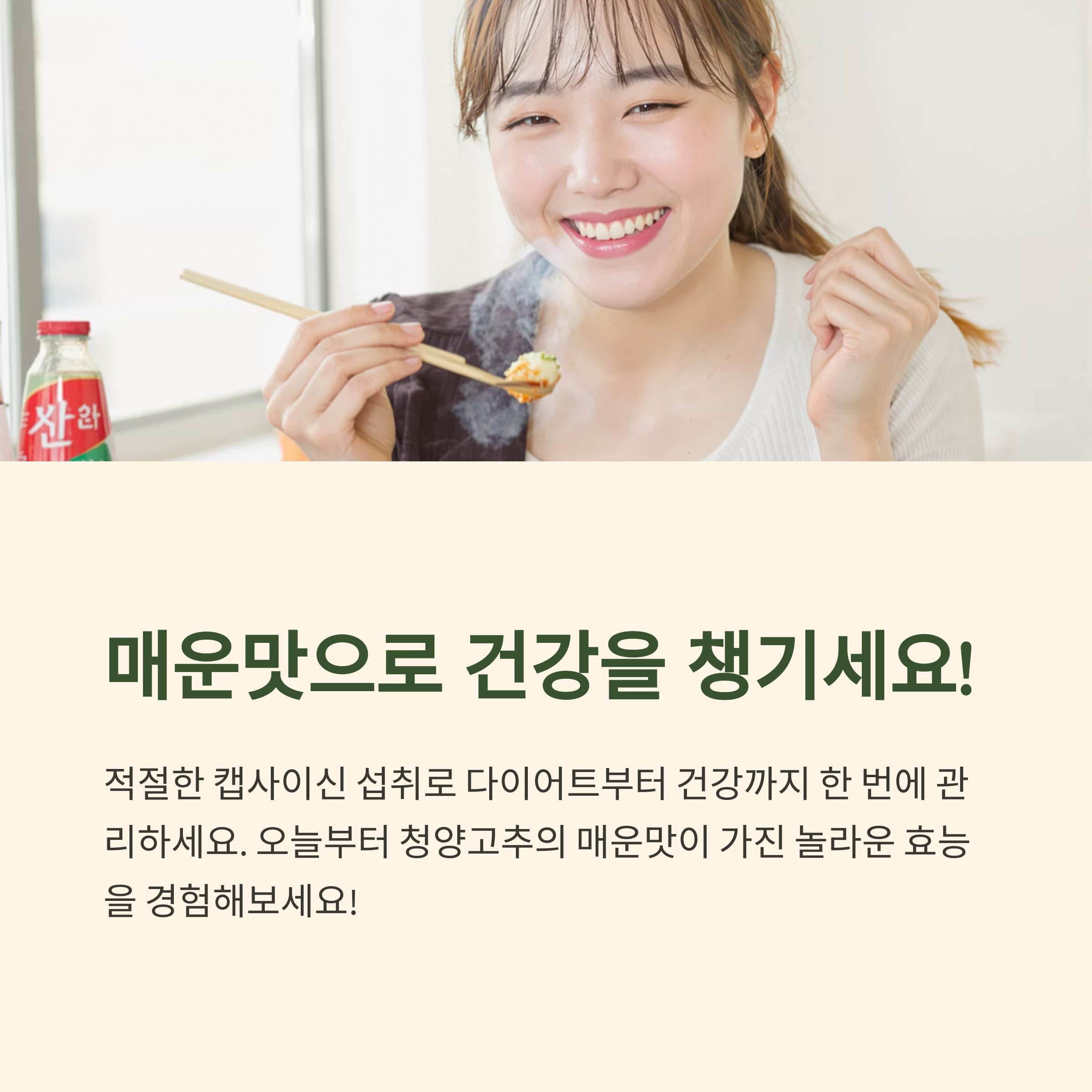 여러분, 오늘 글 어떠셨나요? 그냥 매워서 먹던 청양고추가 사실은 이렇게나 몸에 좋은 보물 상자였다는 사실, 저도 쓰면서 새삼 놀랐답니다. 물론, 뭐든 적당히가 중요하다는 것도요. 가끔은 고추 하나로 스트레스를 날려보는 것도 좋고, 운동과 식단 조절에 살짝 곁들이는 것도 좋은 방법일 거예요. 앞으로 캡사이신을 조금 더 의식적으로, 건강하게 즐겨보는 건 어떨까요? 😊