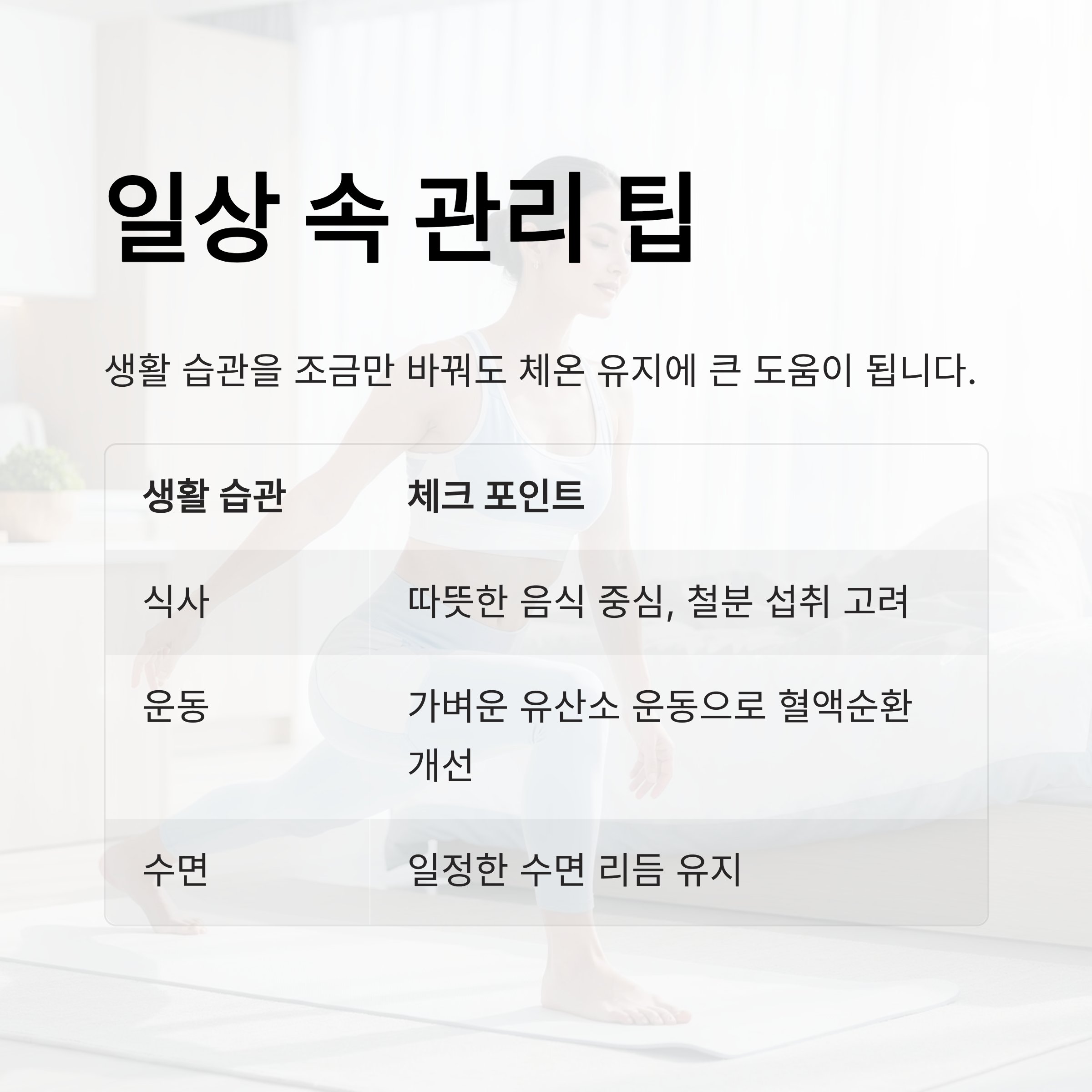 생활 습관을 조금만 바꿔도 체온 유지에 큰 도움이 됩니다.