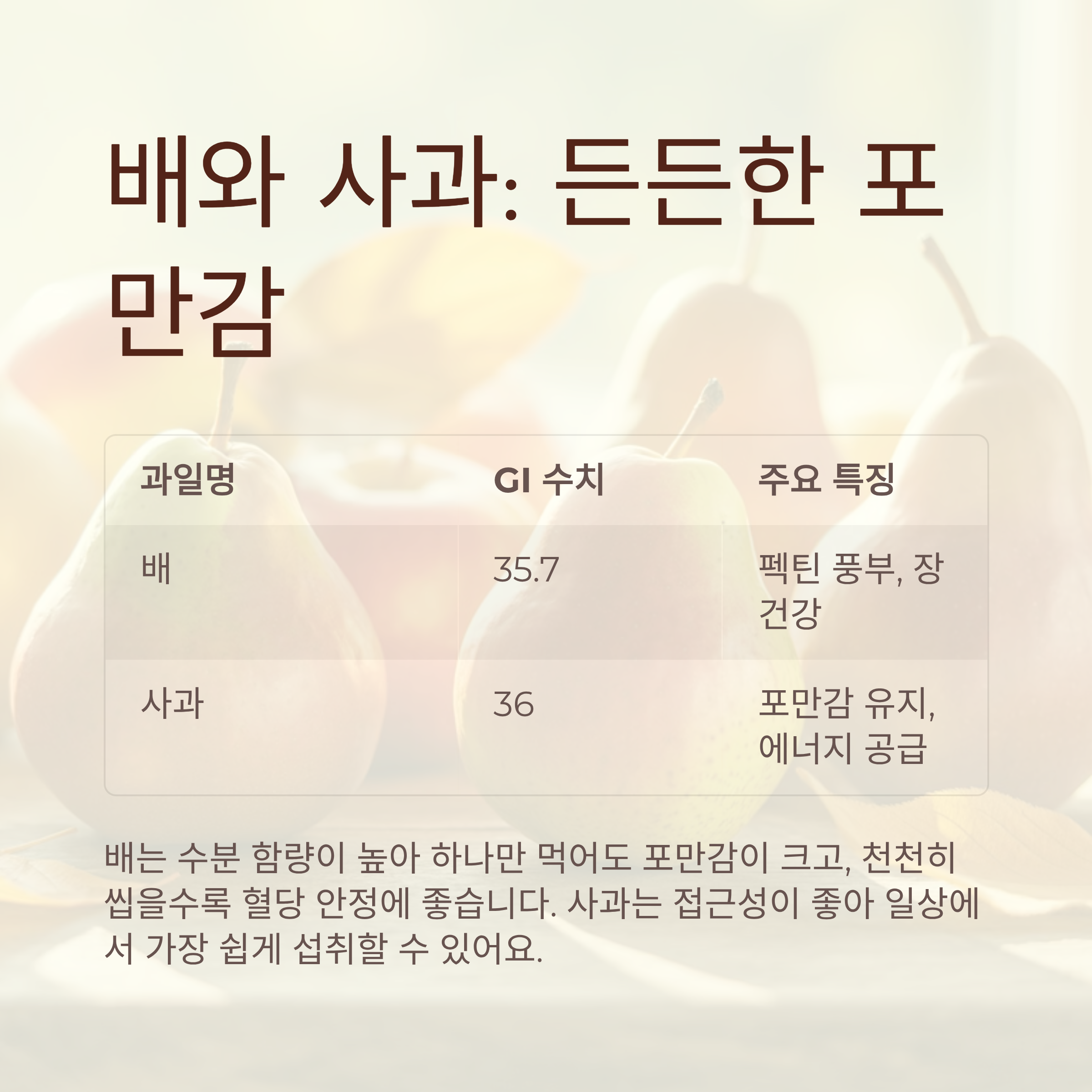 배는 GI 35.7로 비교적 낮은 편이며, '펙틴'이라는 식이섬유가 풍부해 장 건강에 유익합니다.