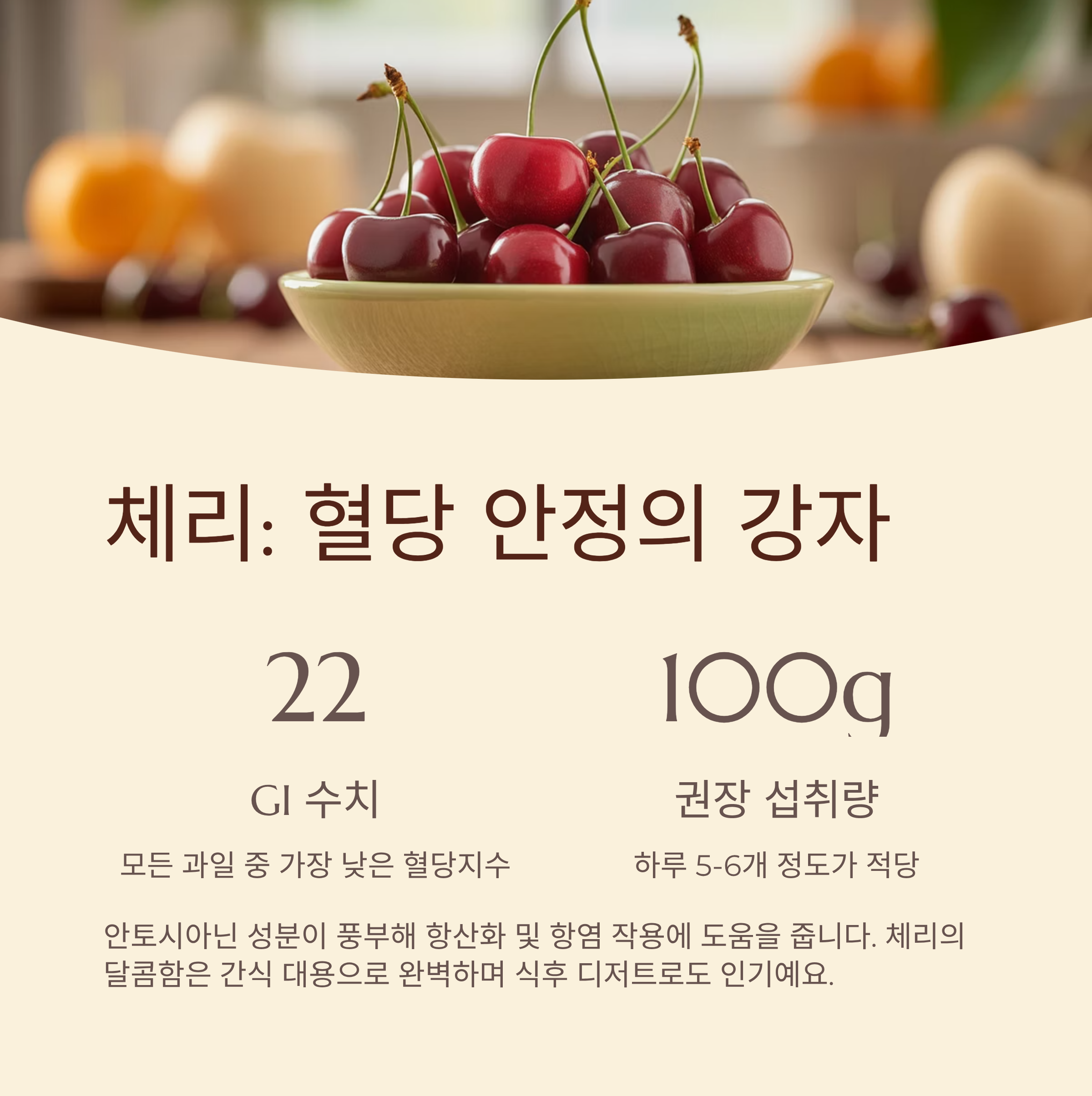 체리는 GI 수치가 22로 모든 과일 중에서도 가장 낮은 편에 속합니다.