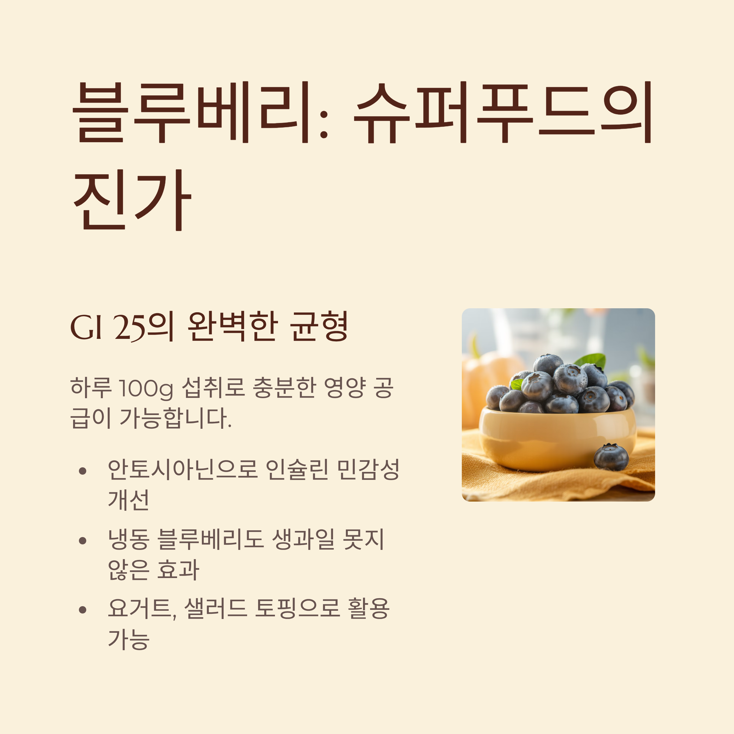 블루베리는 GI가 25로 낮고, 하루 100g 섭취가 적당합니다.