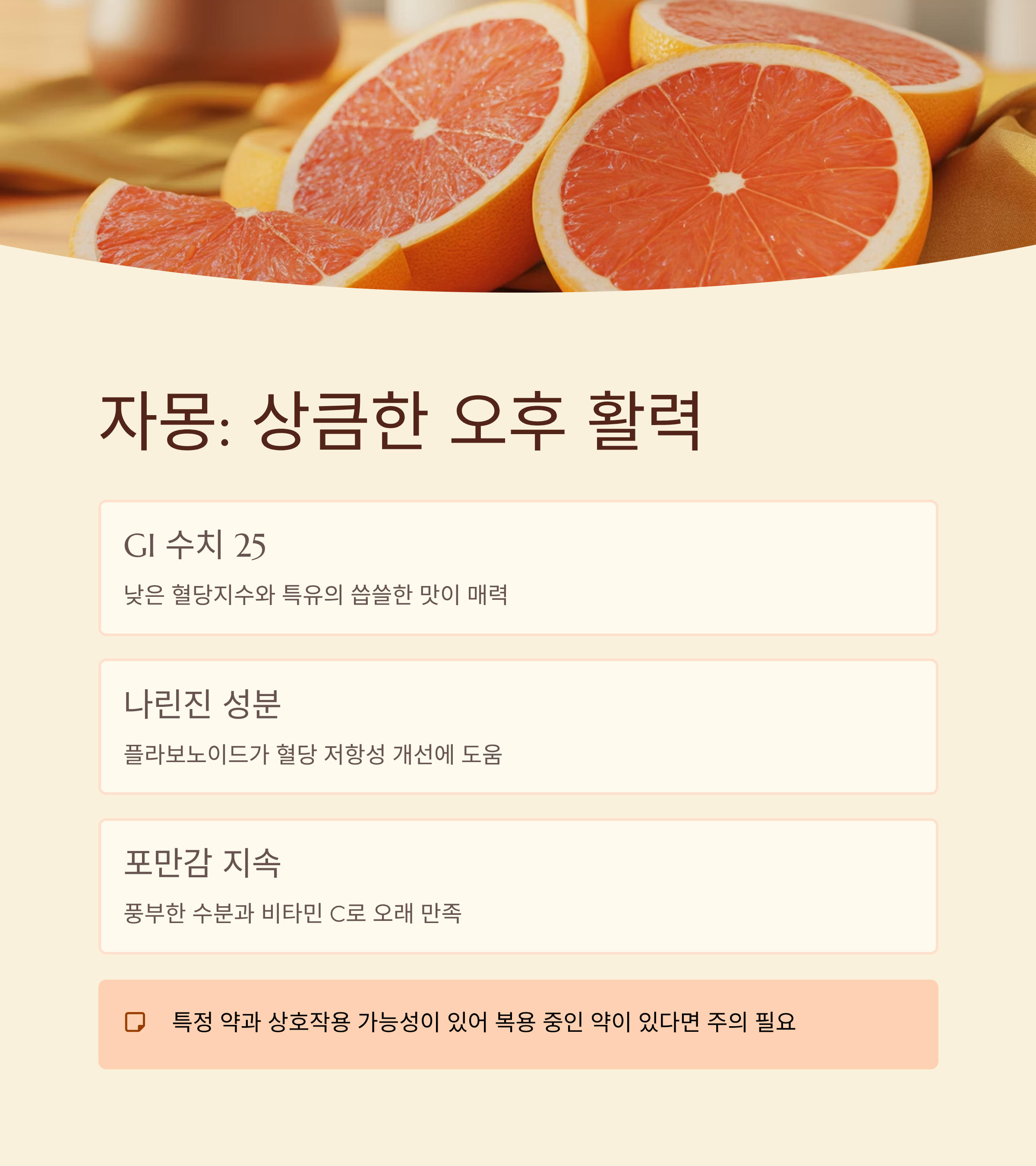 '나린진'이라는 플라보노이드 성분은 혈당 저항성 개선에 도움을 줄 수 있다고 알려져 있으며, 포만감을 오래 지속시켜줘요. 다만 특정 약과 상호작용 가능성이 있어 복용 중인 약이 있다면 주의가 필요합니다.
