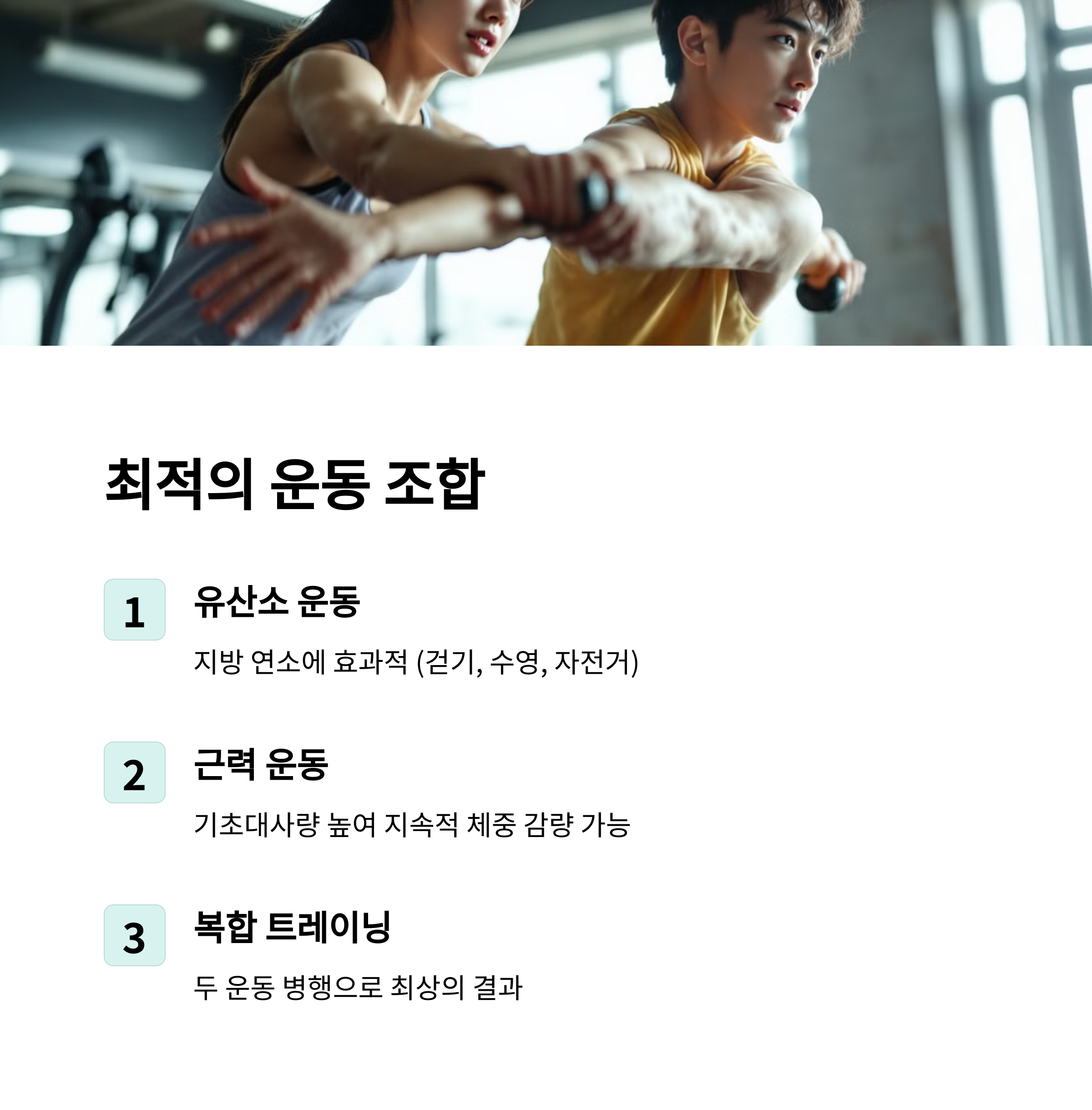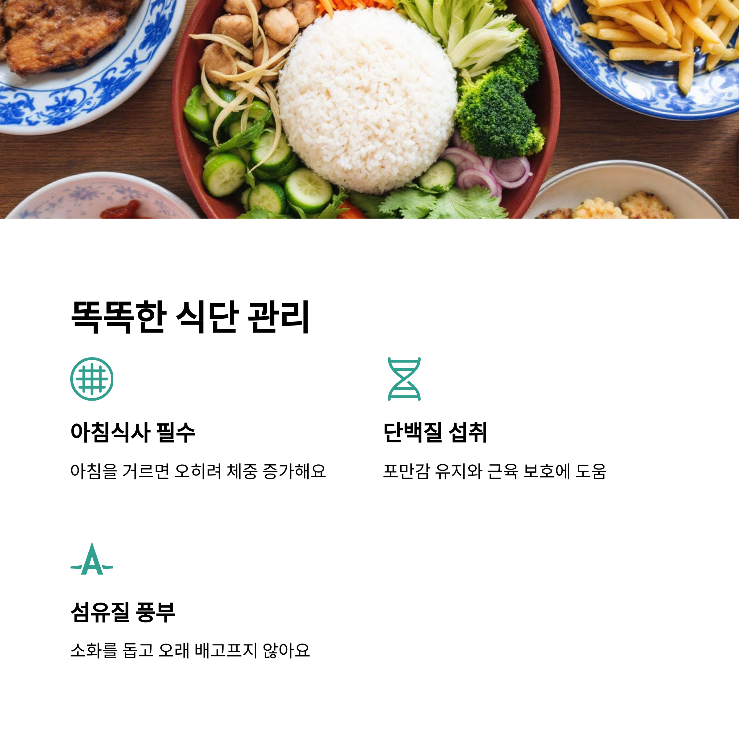 | 균형 잡힌 식사 | 영양소를 골고루 섭취하는 것이 건강한 감량의 핵심입니다. |