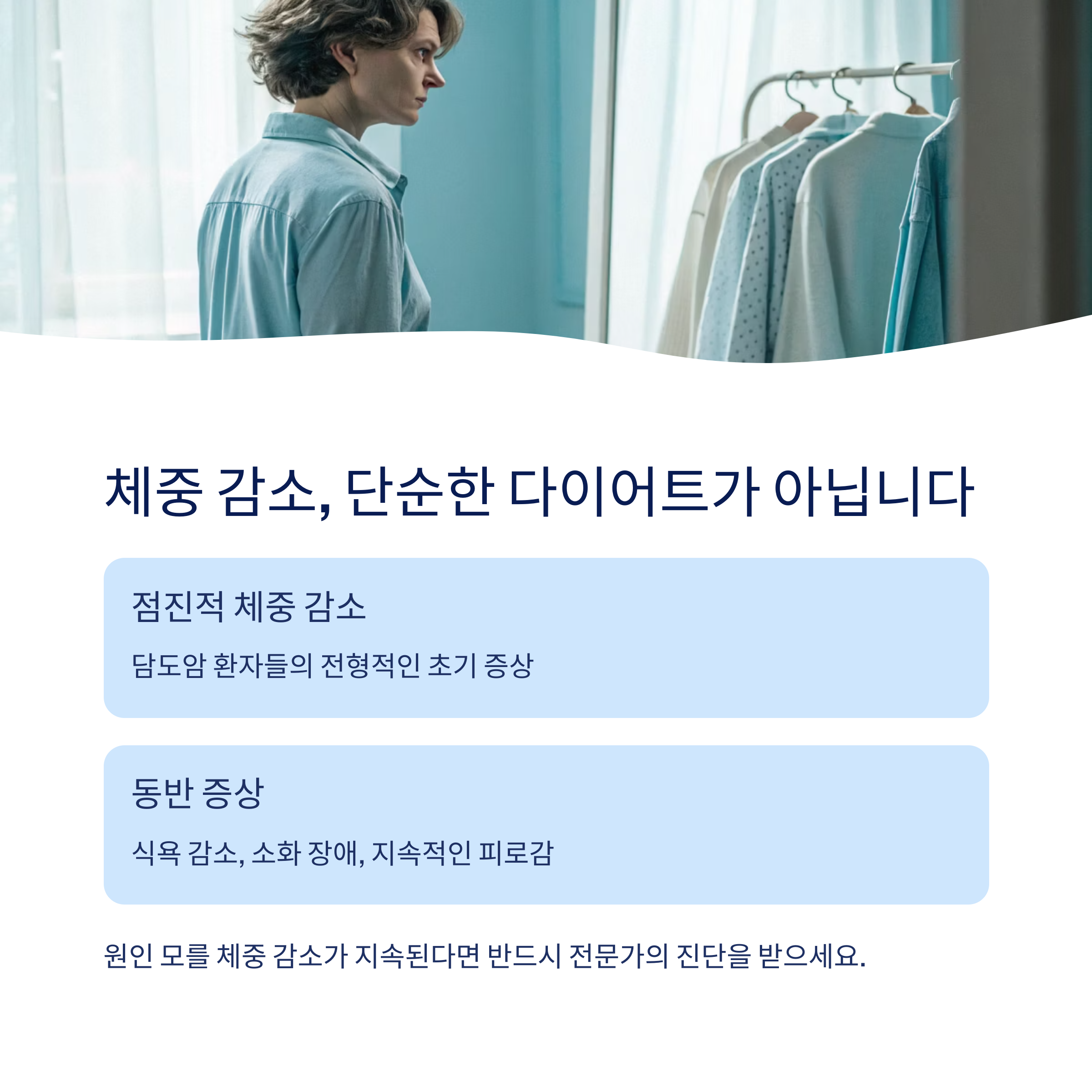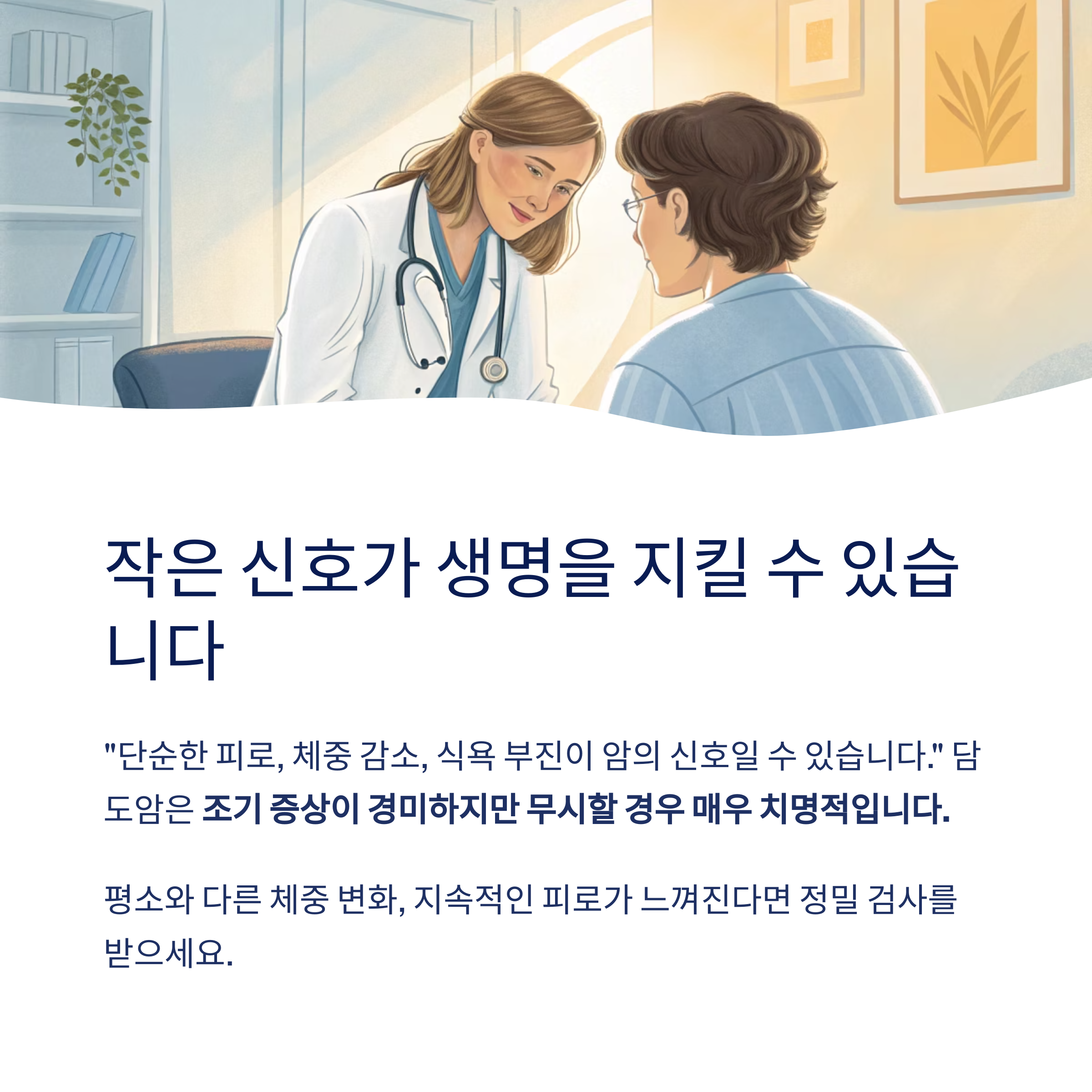 체중 감소, 피로감, 식욕 부진 등 일상적인 증상으로 오인되기 쉬워 주의가 필요합니다.