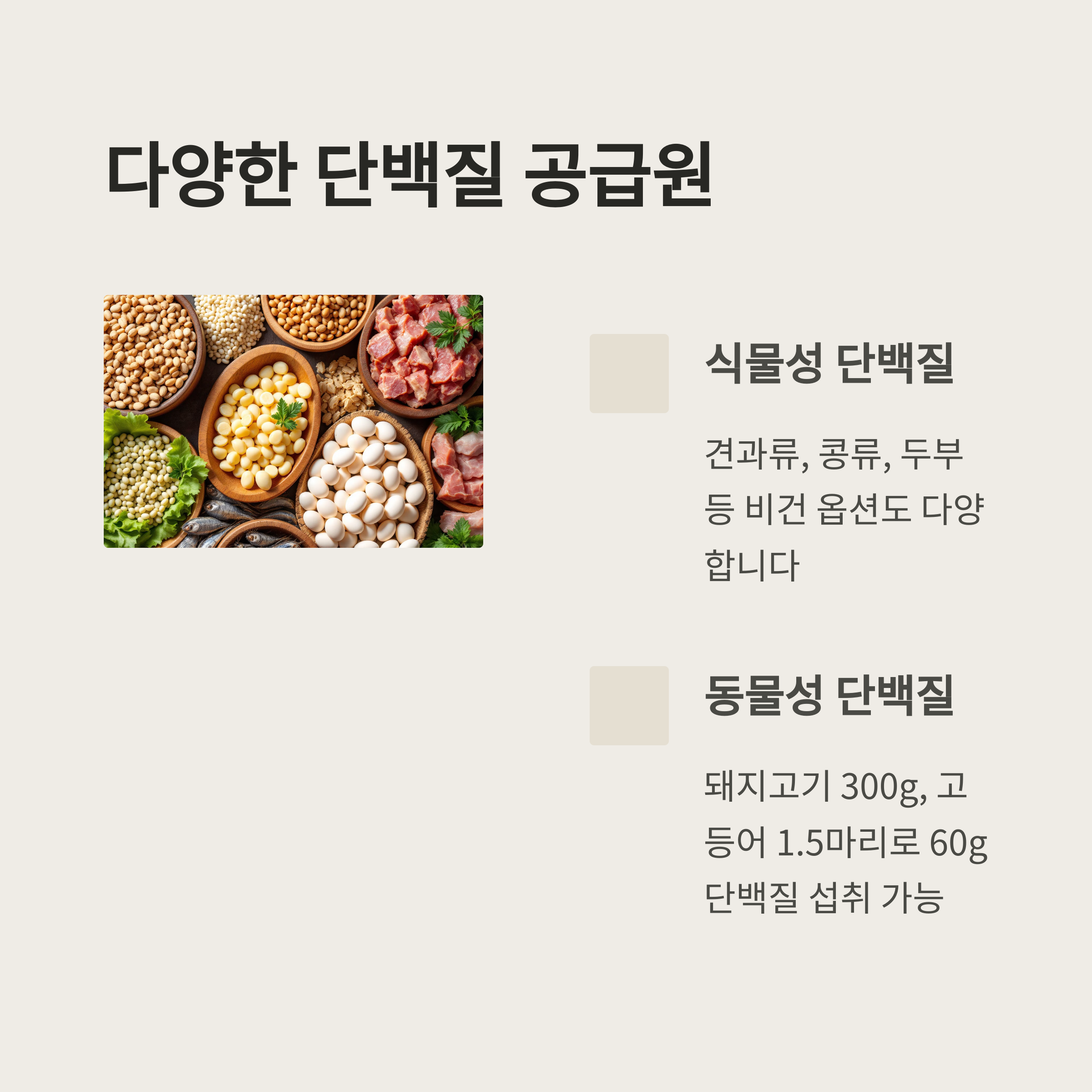 | 돼지 안심, 닭고기, 두부 등 고단백 식품 추천 | 체중 1kg당 1.2~1.6g 권장 섭취량 | BCAA 섭취로 장내 미생물 균형 유지 |