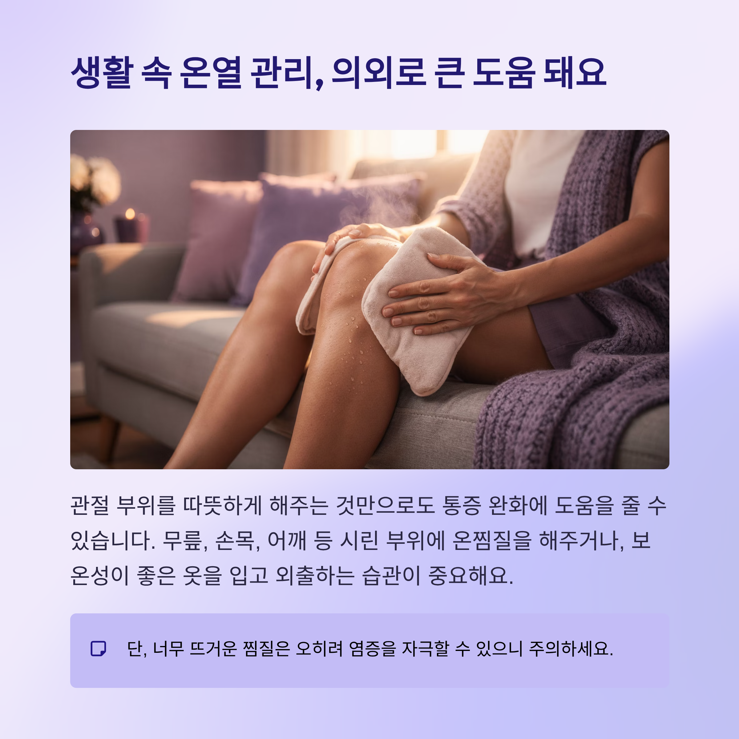 관절 부위를 따뜻하게 해주는 것만으로도 통증 완화에 도움을 줄 수 있습니다.