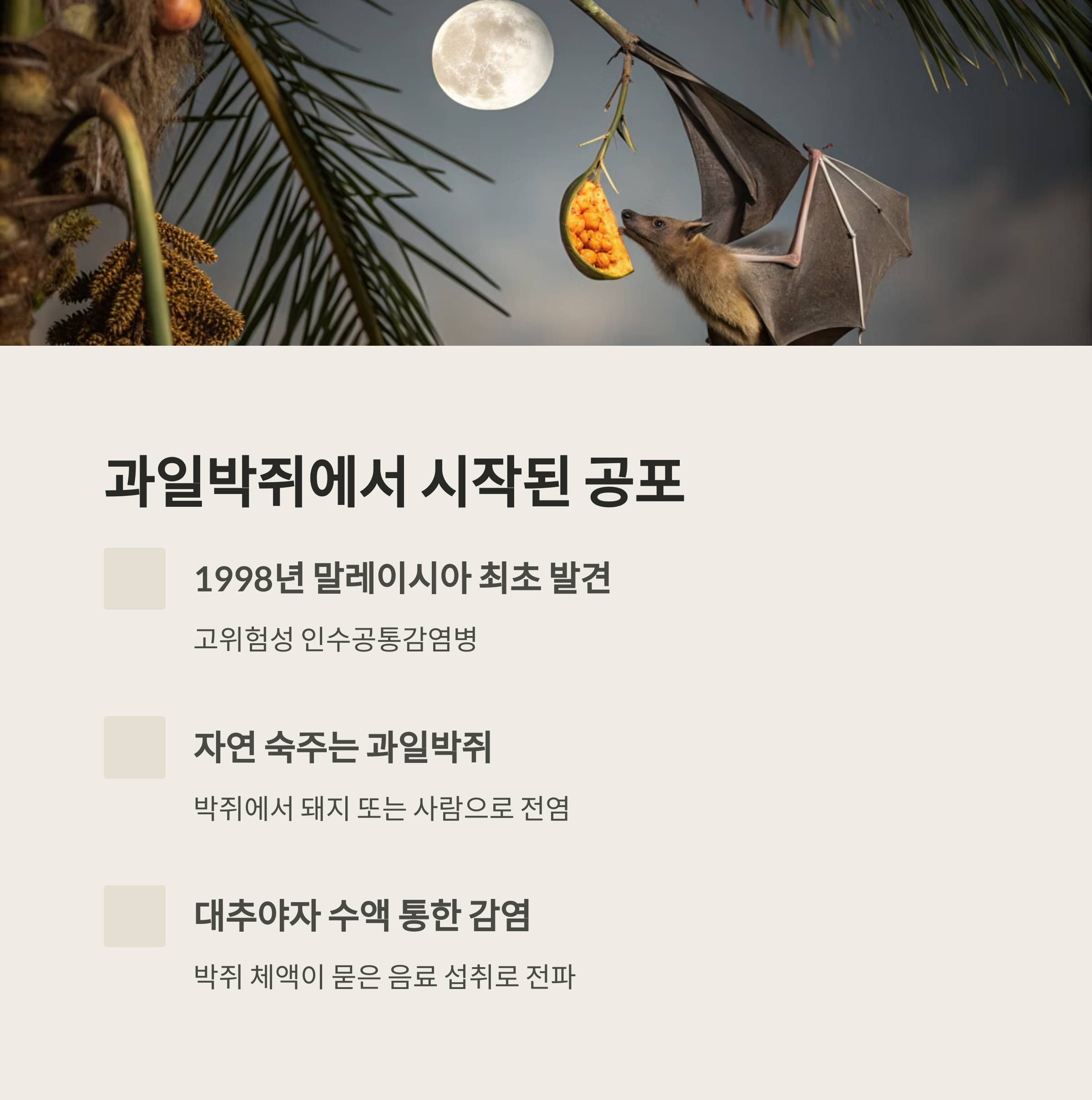 과일박쥐 → 돼지 → 사람, 또는 감염자 체액을 통한 사람 간 전염 가능성도 존재합니다.