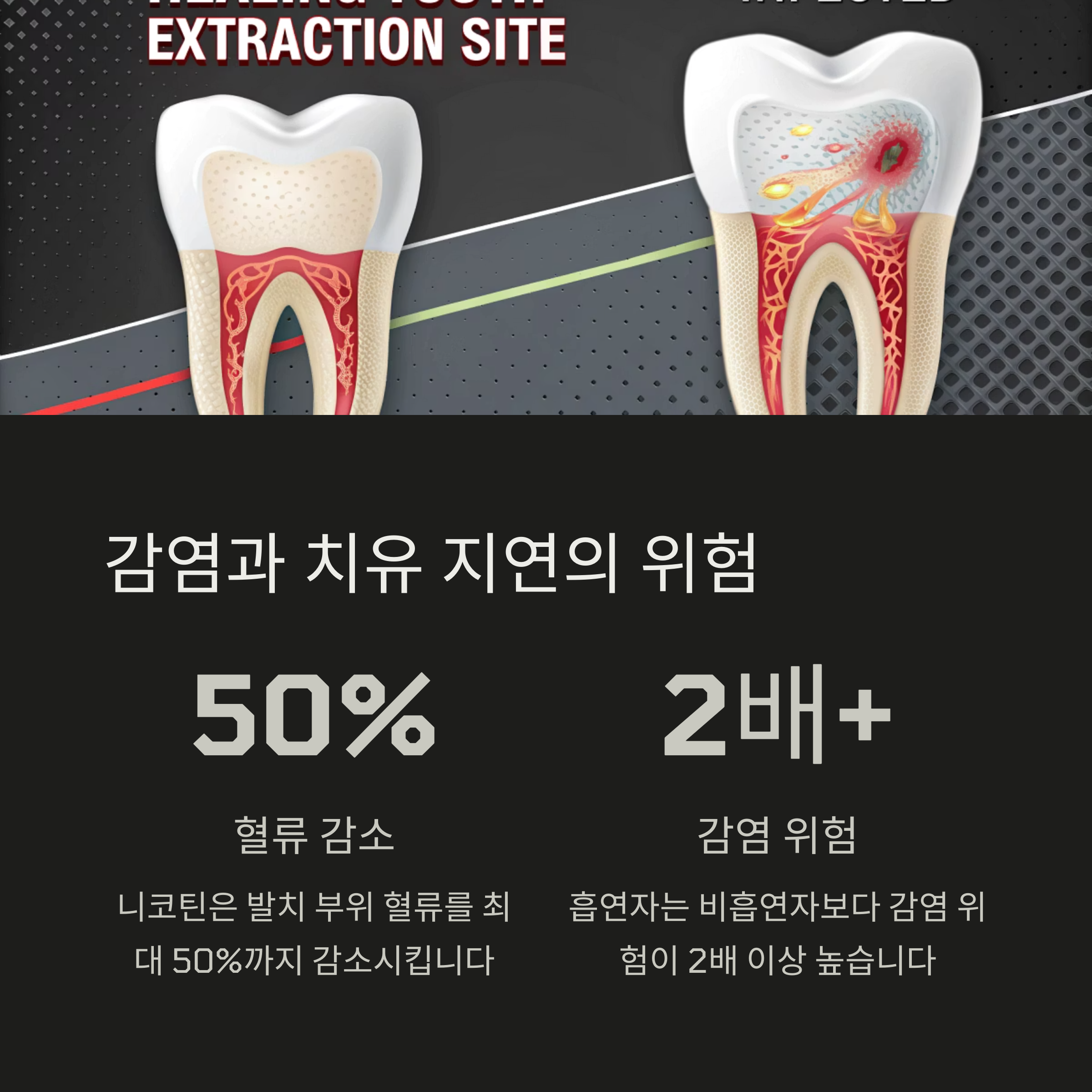 담배 속 니코틴은 혈관을 수축시켜 발치 부위로 가는 혈류를 30%~50%까지 줄입니다.