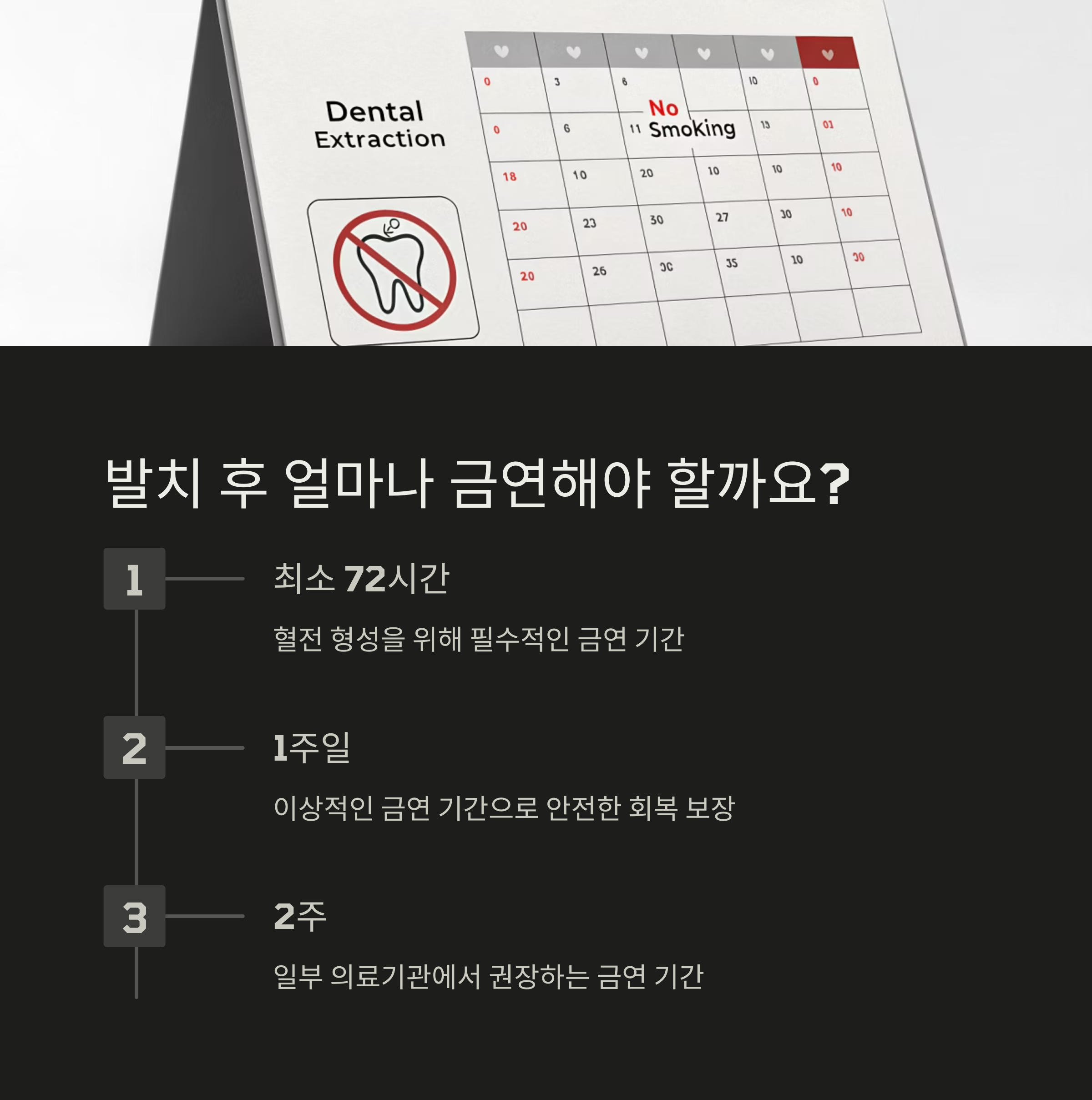 발치 후 최소 72시간은 혈전 형성을 위해 금연이 필수이며,