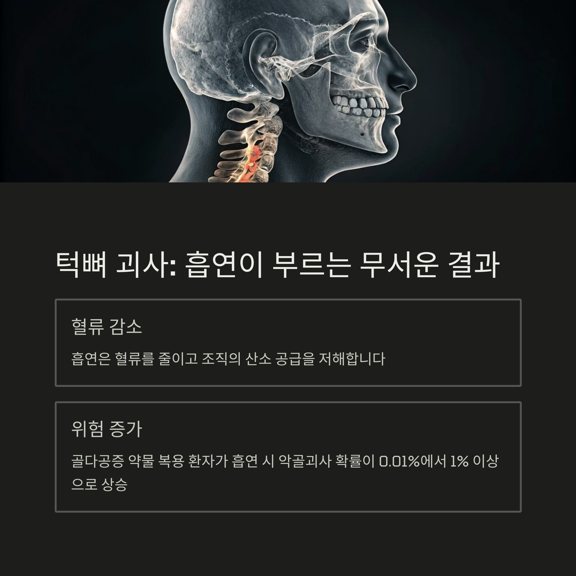 흡연은 단순한 치유 지연을 넘어, 턱뼈 괴사라는 심각한 결과로 이어질 수 있습니다.