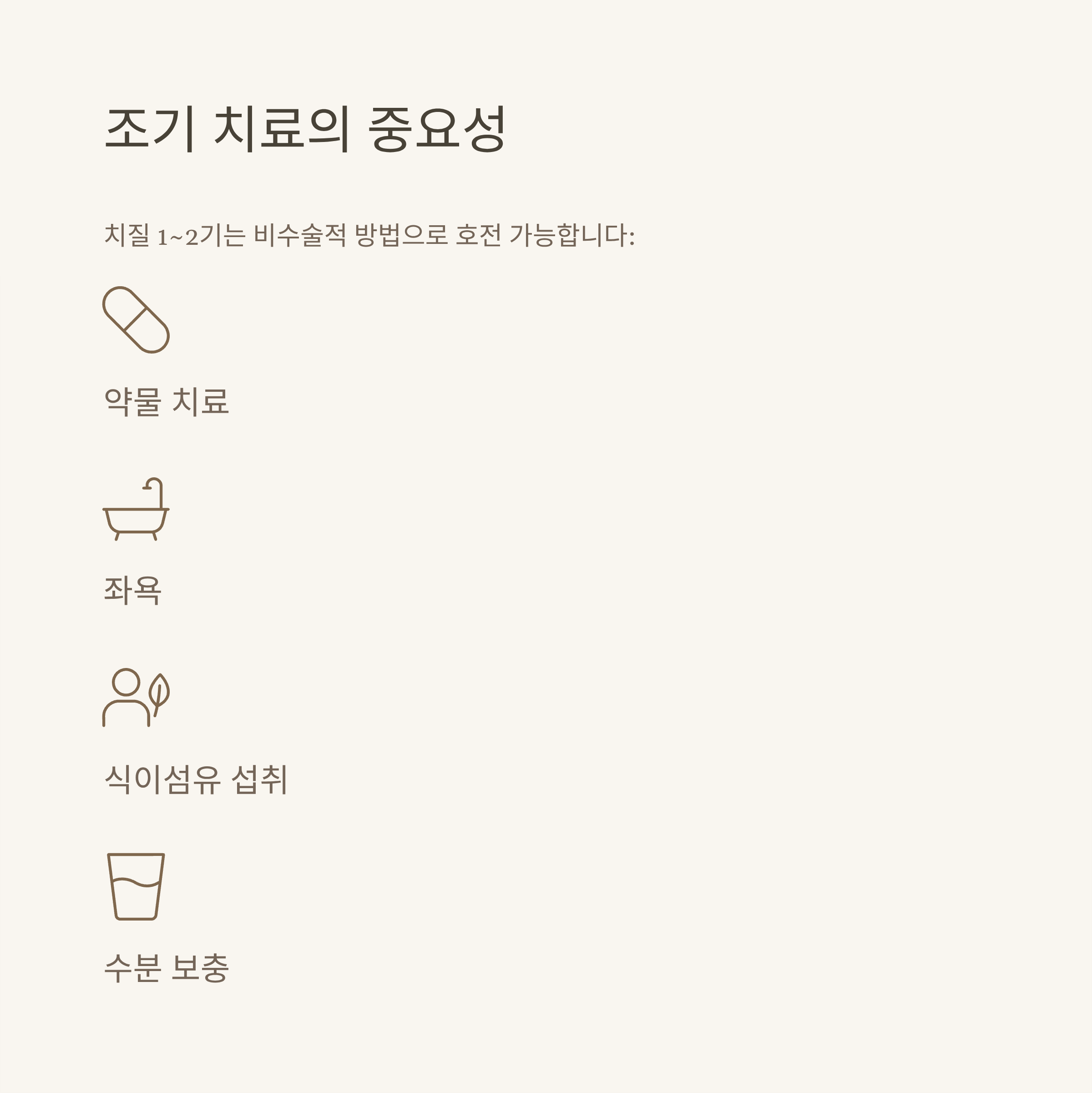 | 1기~2기 | 약물·좌욕·식이 조절 | 70% 이상 비수술 치료 가능 |