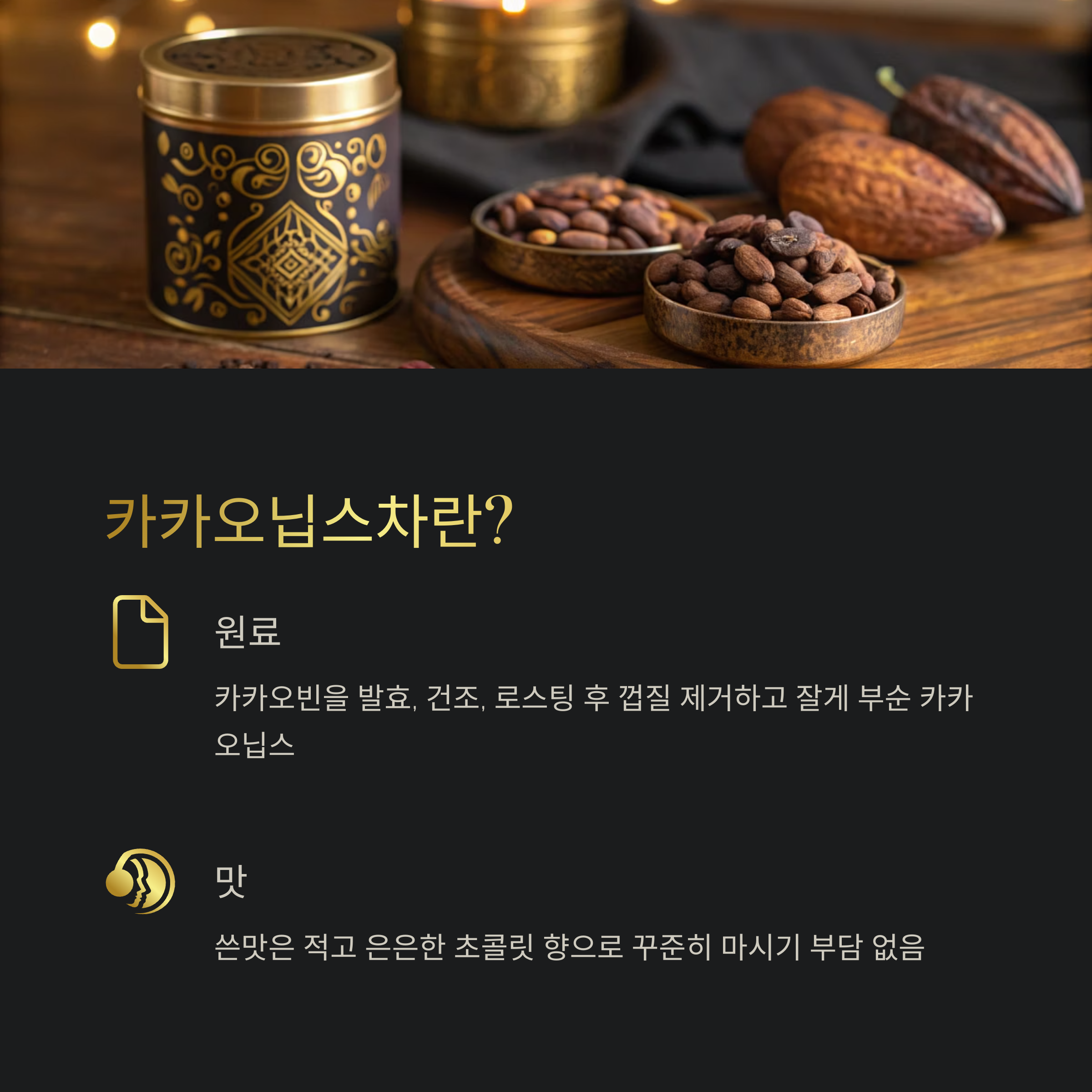 카카오닙스차는 초콜릿의 원료인 카카오빈을 발효, 건조, 로스팅한 뒤