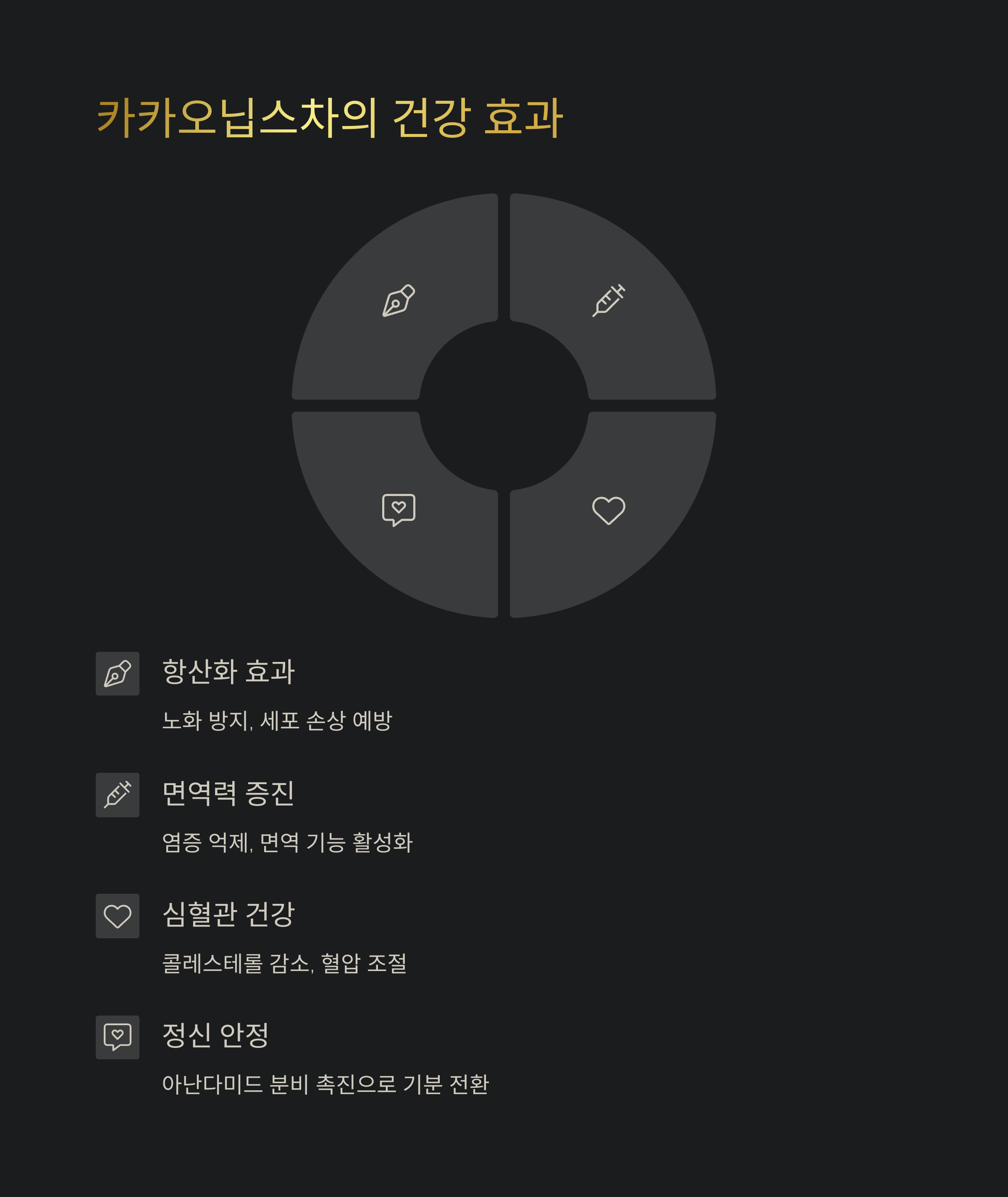 카카오닙스차가 주는 건강상 이점은 다음과 같습니다.