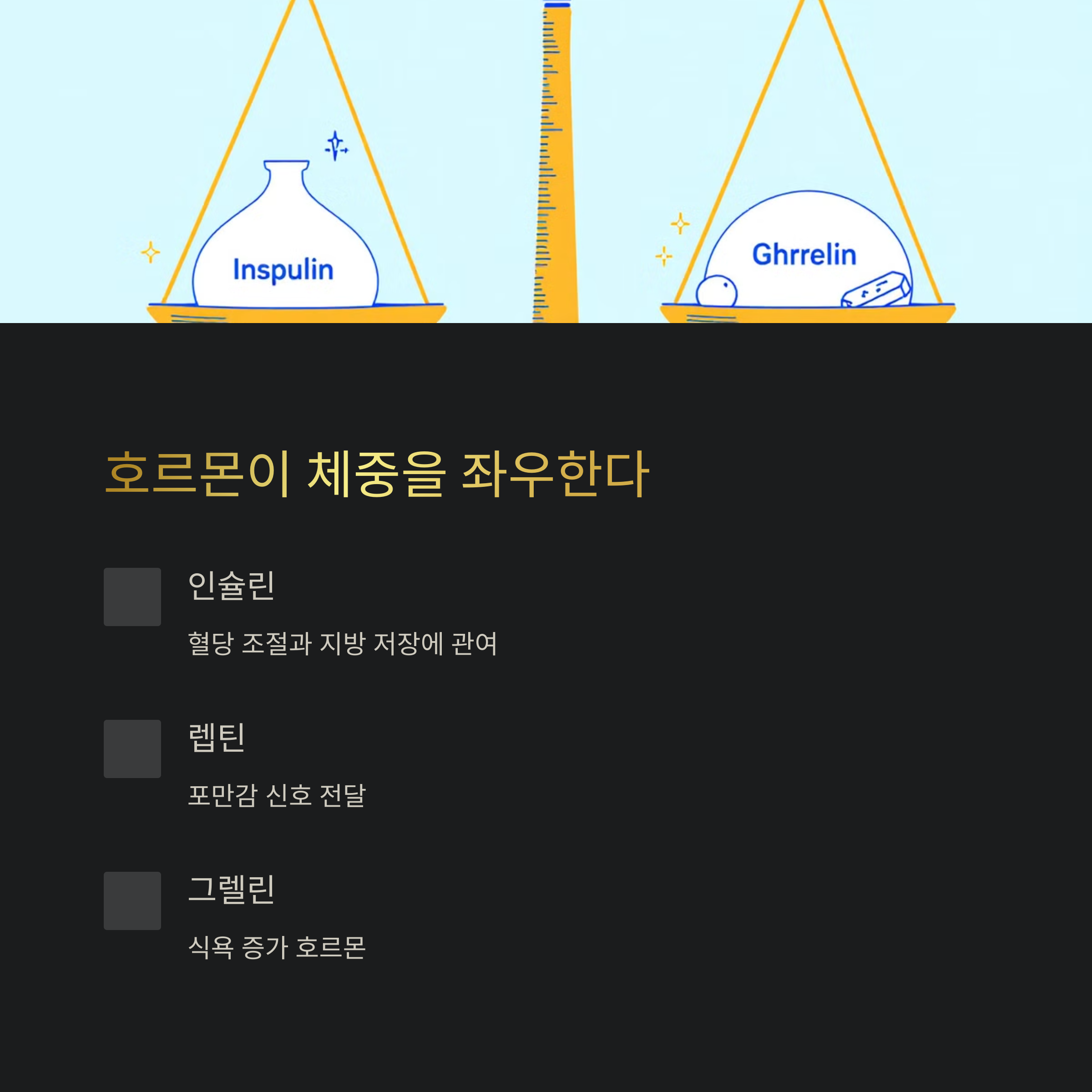 | 렙틴 | 포만감 신호 | 렙틴 저항성이 생기면 과식 위험 증가 |