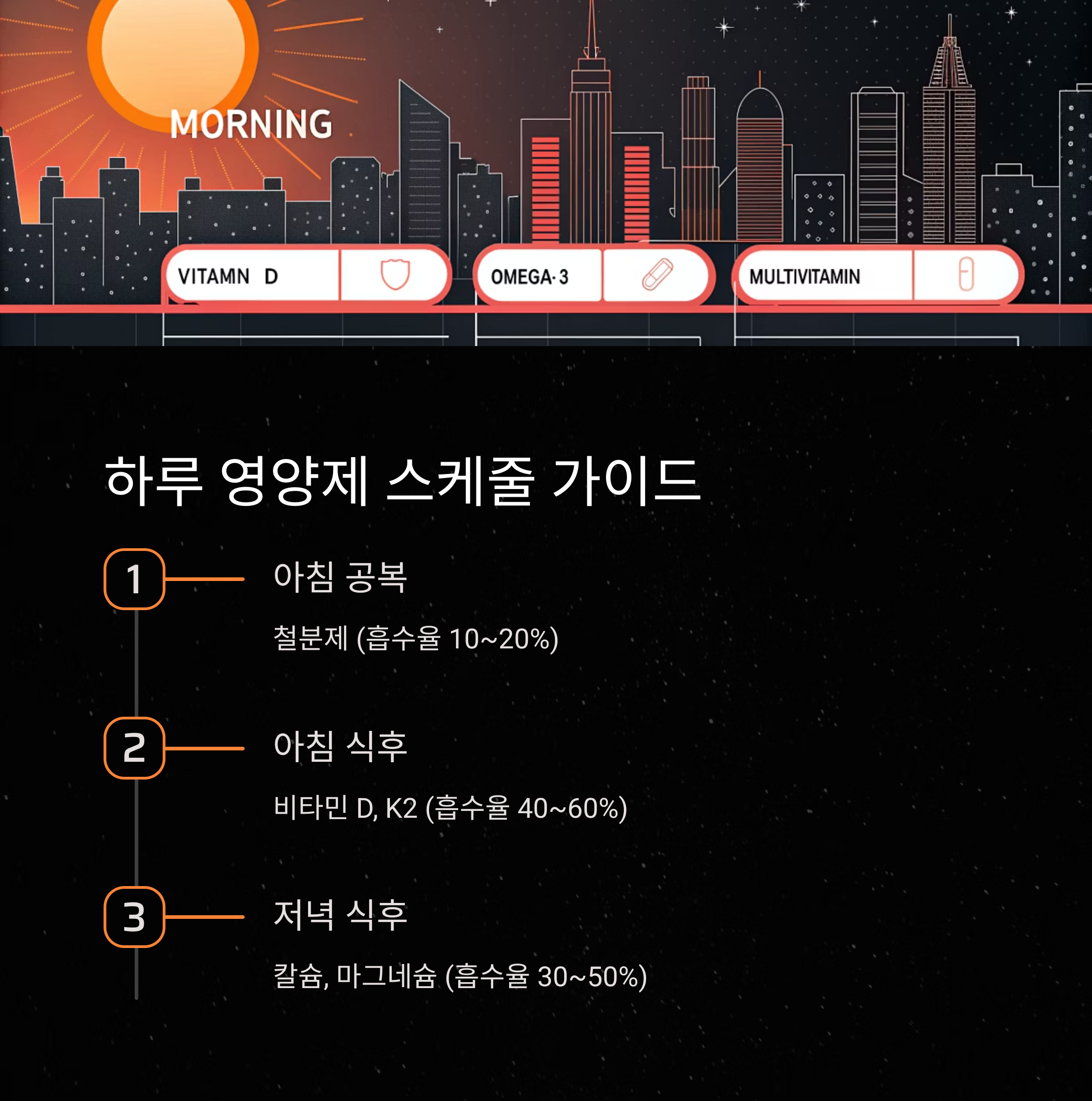| 아침 식사 후 | 비타민 D, K2 | 40%~60% | 밤 복용 피함 |
