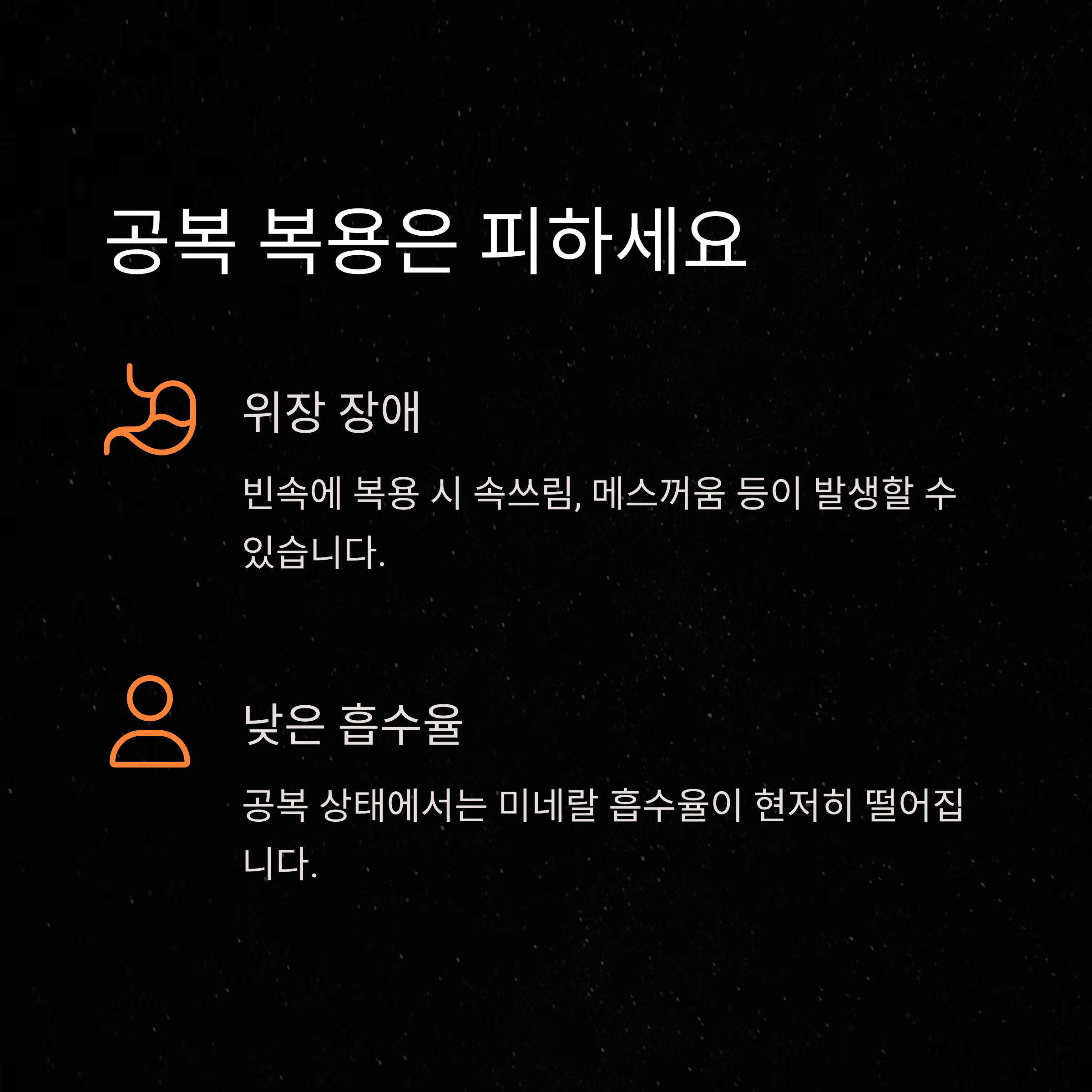 빈속에 칼슘이나 마그네슘을 복용하면 속쓰림, 메스꺼움 등의