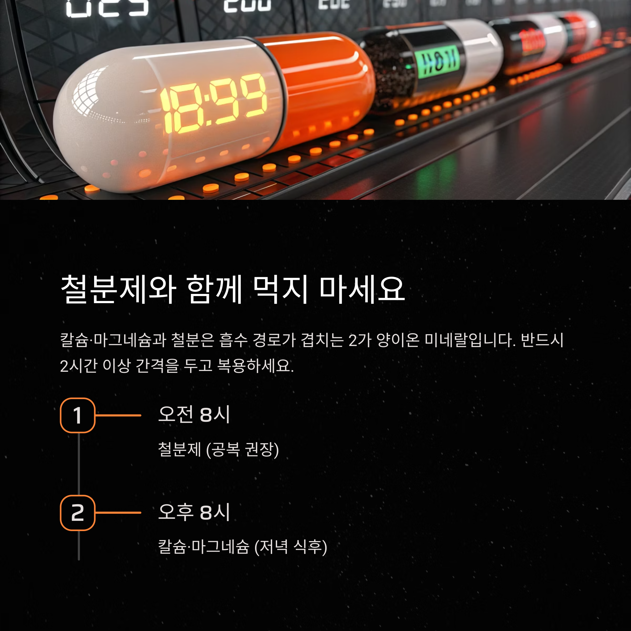 | 칼슘·마그네슘 | 오후 8시 | 철분과 2시간 이상 간격 |