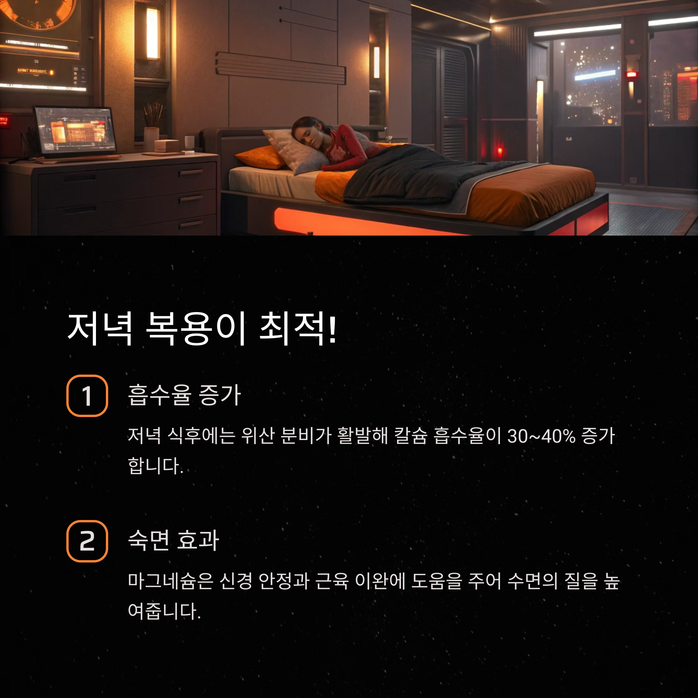 | 저녁 식사 후 | 칼슘, 마그네슘 | 칼슘 30%~40%, 마그네슘 30%~50% | 철분과 간격 필요 |