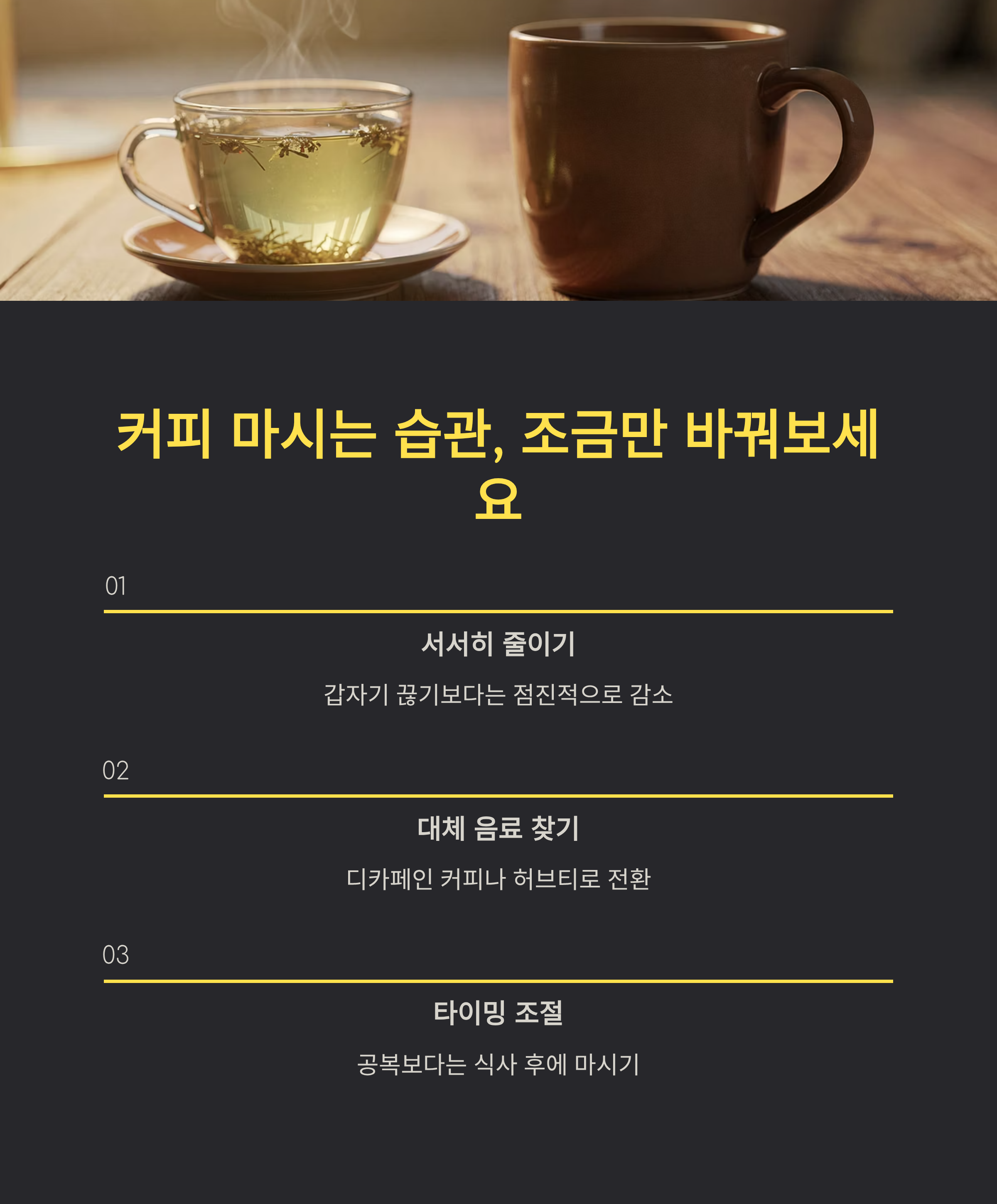 갑자기 카페인을 끊기보다는 서서히 줄이는 것이 좋습니다. 디카페인 커피나 허브티로 대체해보는 것도 방법입니다. 또 공복보다는 식사 후에 마시는 게 신체 자극을 줄여줄 수 있습니다.