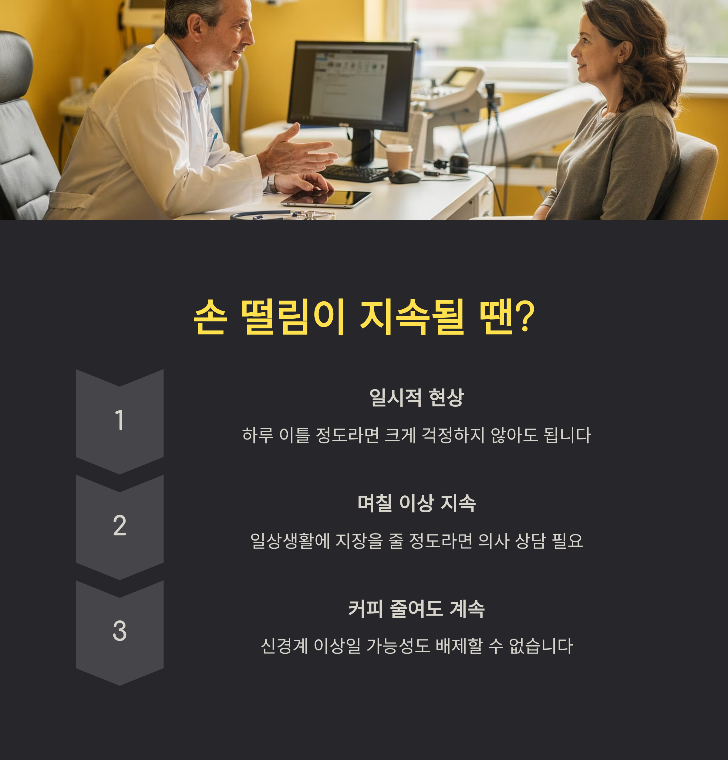 일시적인 현상이라면 크게 걱정하지 않아도 됩니다. 하지만 며칠 이상 계속되거나 일상생활에 지장을 줄 정도라면 의사 상담이 필요합니다. 특히 커피를 줄였음에도 증상이 지속된다면 신경계 이상일 가능성도 배제할 수 없습니다.