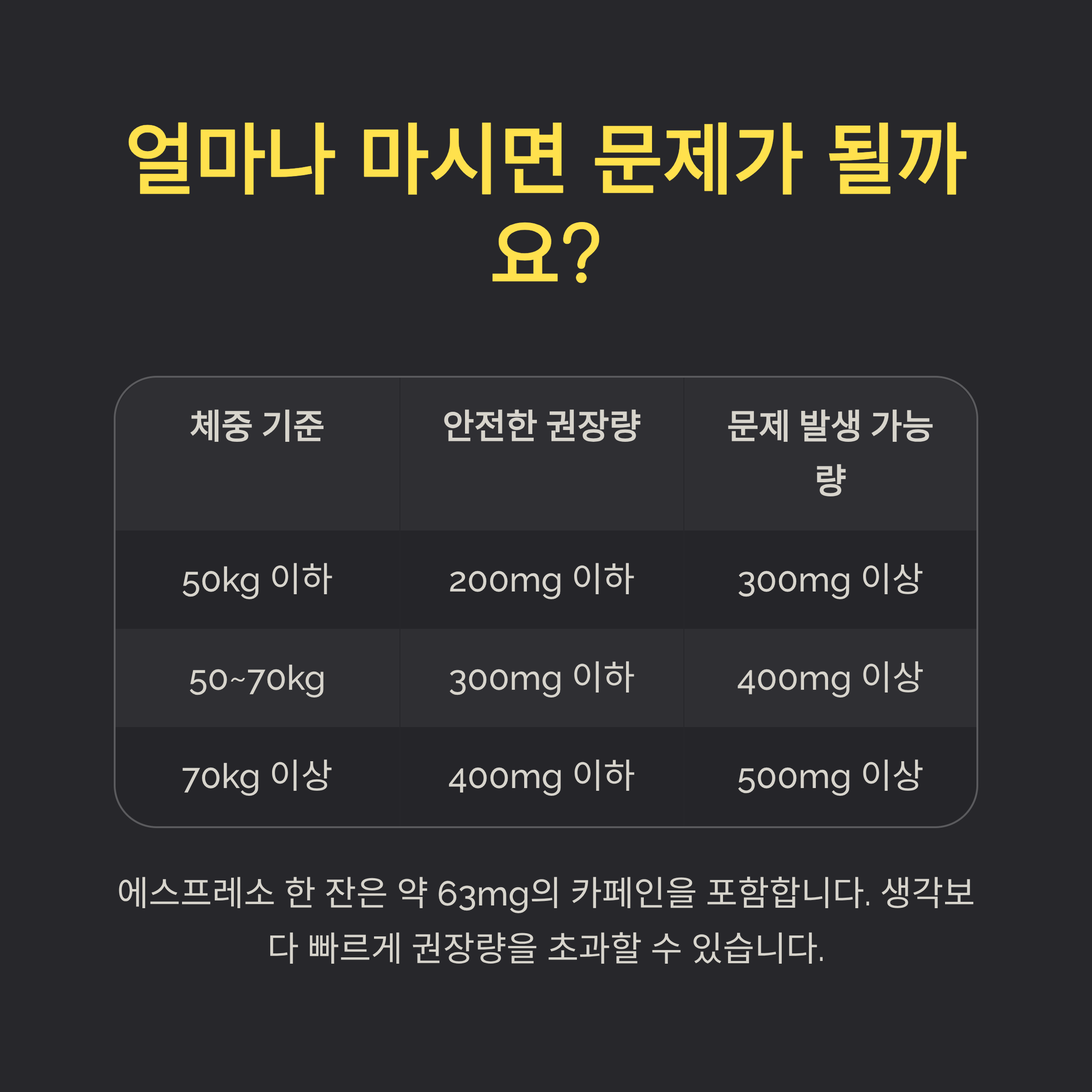 위 표를 참고해 하루 커피 섭취량을 조절해보세요. 에스프레소 한 잔은 약 63mg의 카페인을 포함합니다. 생각보다 빠르게 권장량을 초과할 수 있습니다.