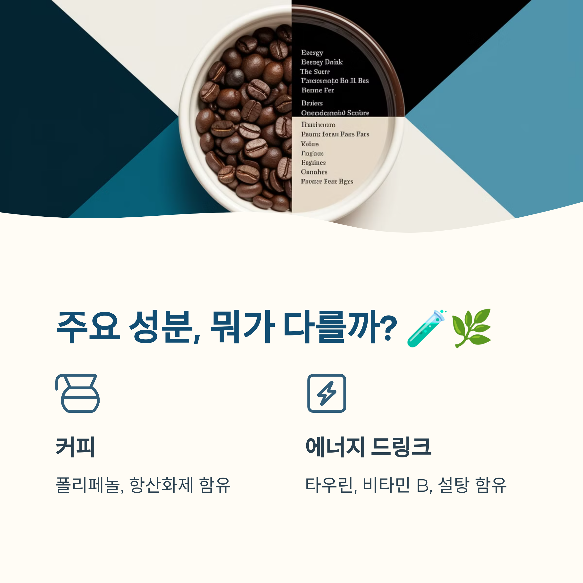 커피와 에너지 드링크의 가장 큰 공통점은 카페인을 포함하고 있다는 점입니다. 하지만 그 외 성분에는 큰 차이가 있습니다. 커피는 자연적으로 추출된 음료로, 당분이 없고 항산화 물질이 풍부하여 건강에 도움이 될 수 있습니다. 반면, 에너지 드링크는 카페인 외에도 타우린, 인공 감미료, B군 비타민 등의 성분이 포함되어 있습니다. 특히, 에너지 드링크는 높은 당분 함량으로 인해 과다 섭취 시 비만, 혈당 급상승, 심혈관 건강 악화 등의 부작용이 나타날 수 있습니다.