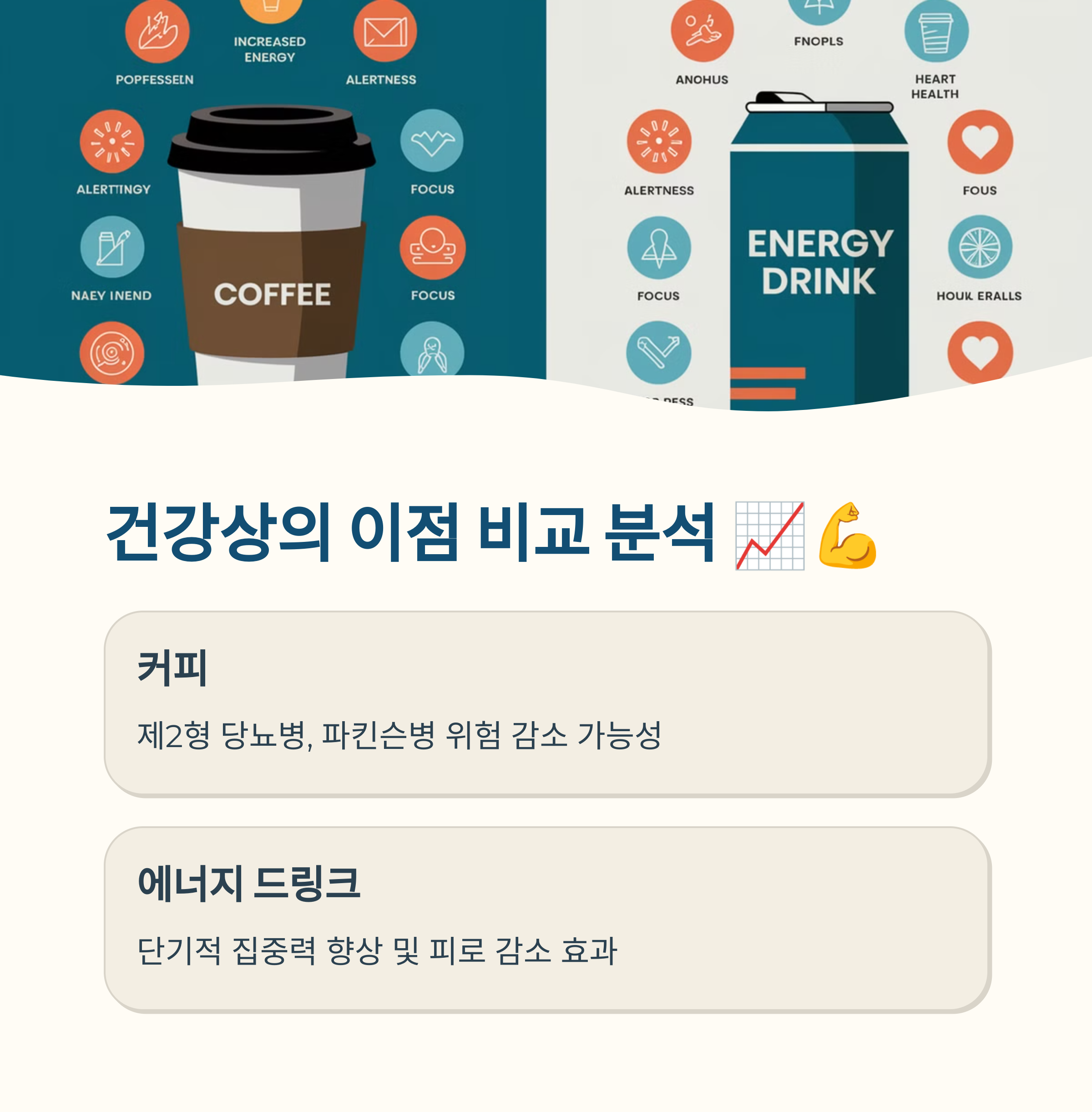 건강에 미치는 영향도 비교해보아야 합니다. 커피는 적정량 섭취 시 심장 건강을 개선하고 당뇨병 예방에도 도움이 될 수 있습니다. 하지만 너무 많이 마시면 위산 과다 분비, 불면증, 불안 등의 부작용이 발생할 수 있습니다. 반면, 에너지 드링크는 단기적으로 집중력을 높이고 피로를 해소하는 효과가 있지만, 과도한 당분과 첨가물이 심장 건강에 부정적인 영향을 미칠 수 있습니다.