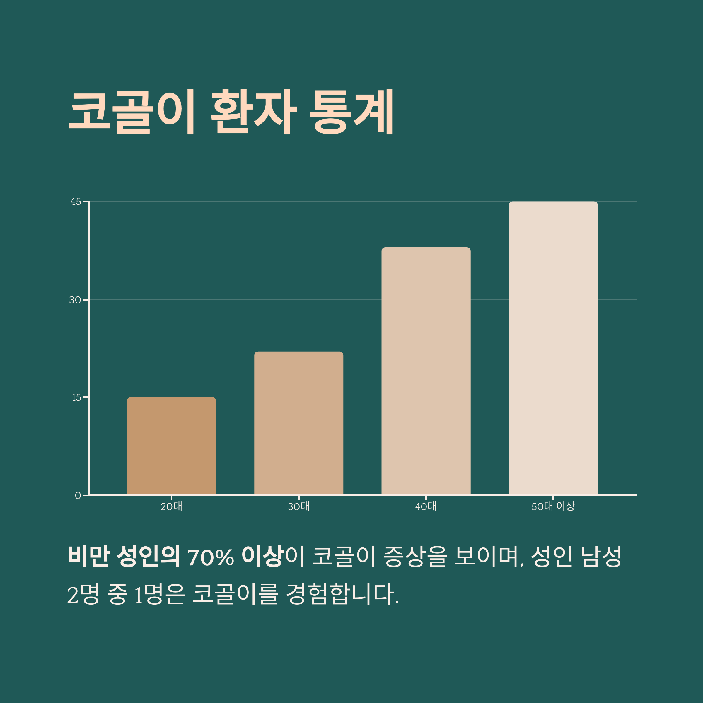 성인 남성 2명 중 1명은 코골이를 경험합니다.