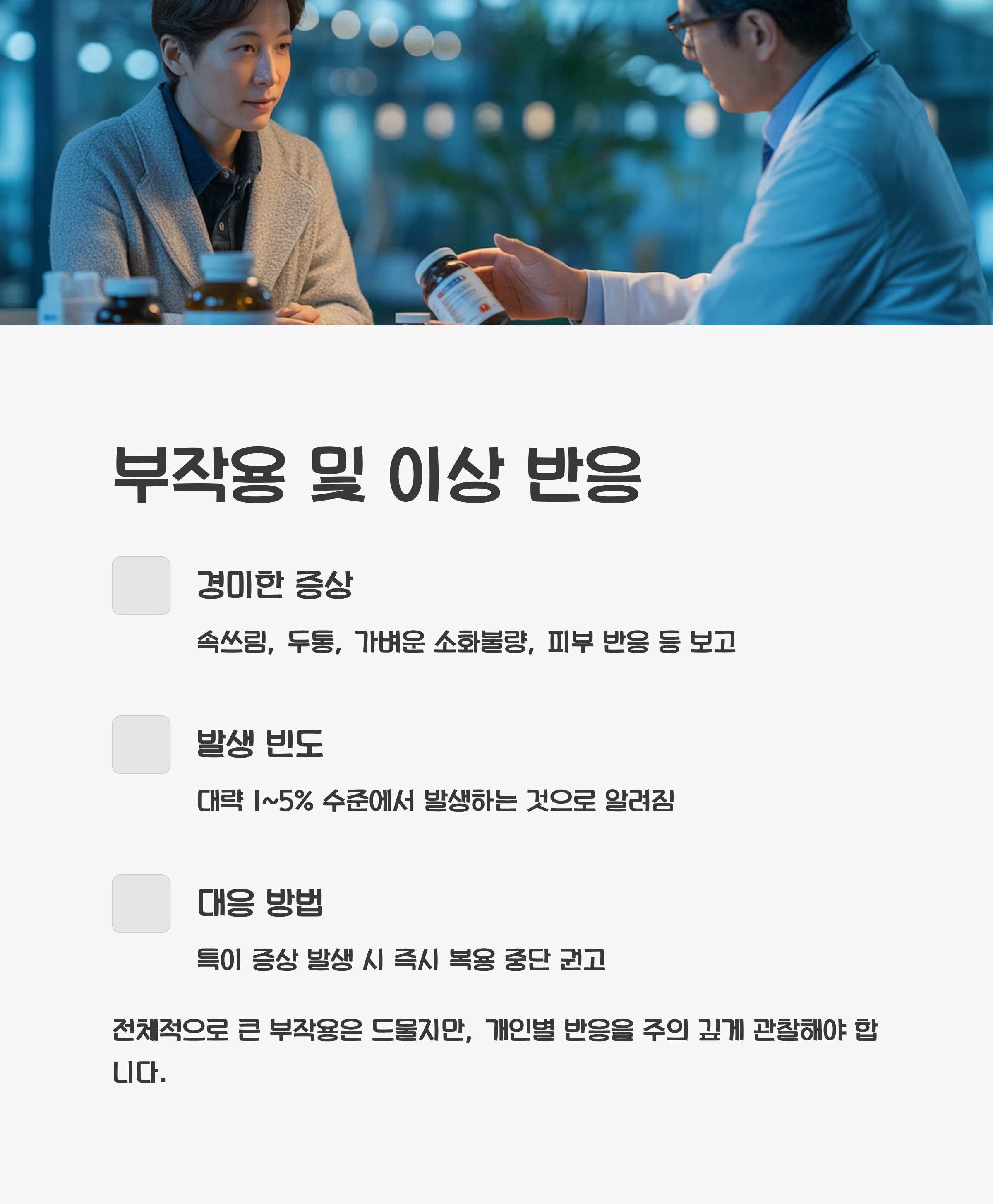 대략 1~5% 수준에서 발생한다고 알려져 있으며, 복용 중 특이 증상이 있다면 즉시 중단이 권고됩니다.