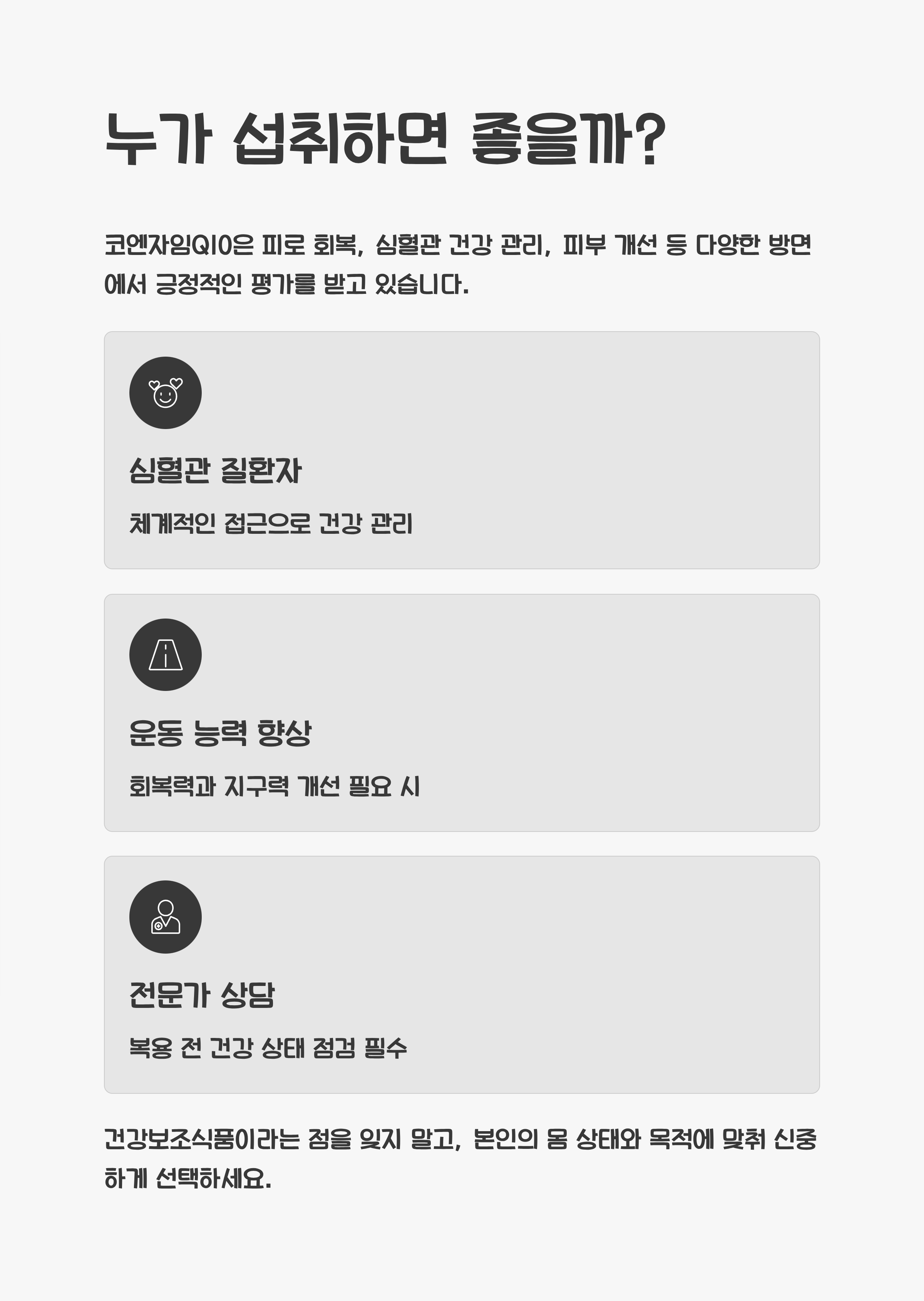 건강보조식품이라는 점을 잊지 말고, 본인의 몸 상태와 목적에 맞춰 신중하게 선택해 보시기 바랍니다.