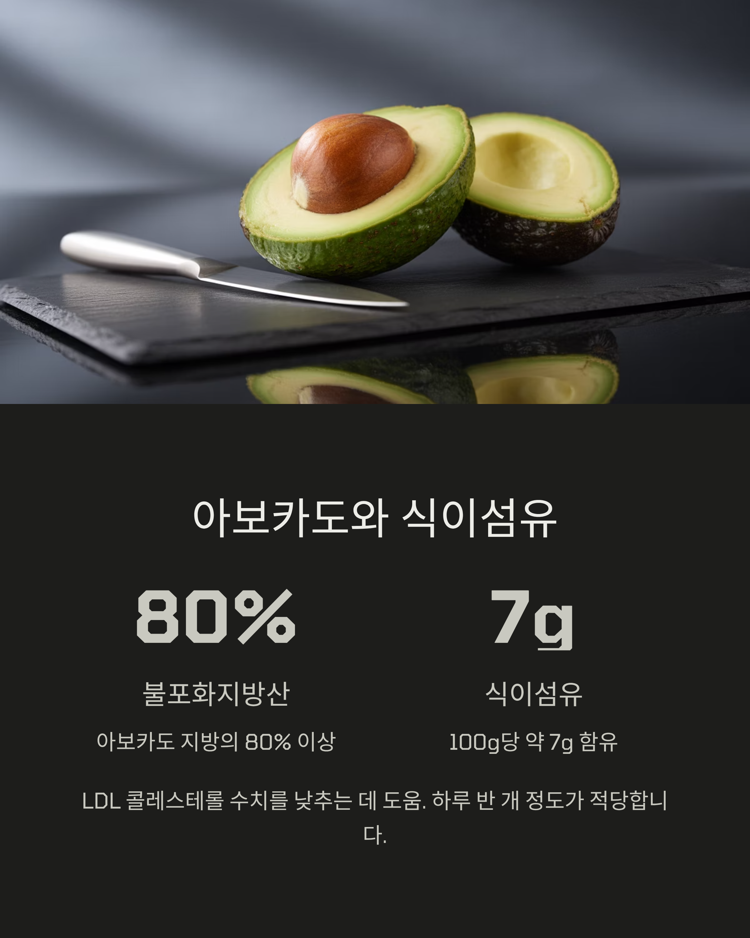 아보카도는 지방의 80% 이상이 불포화지방산이며 100g에 약 7g의 식이섬유가 들어 있습니다. 이 두 가지 성분은 LDL 콜레스테롤 수치를 낮추는 데 도움이 될 수 있으며, 하루 반 개 정도가 적당합니다.