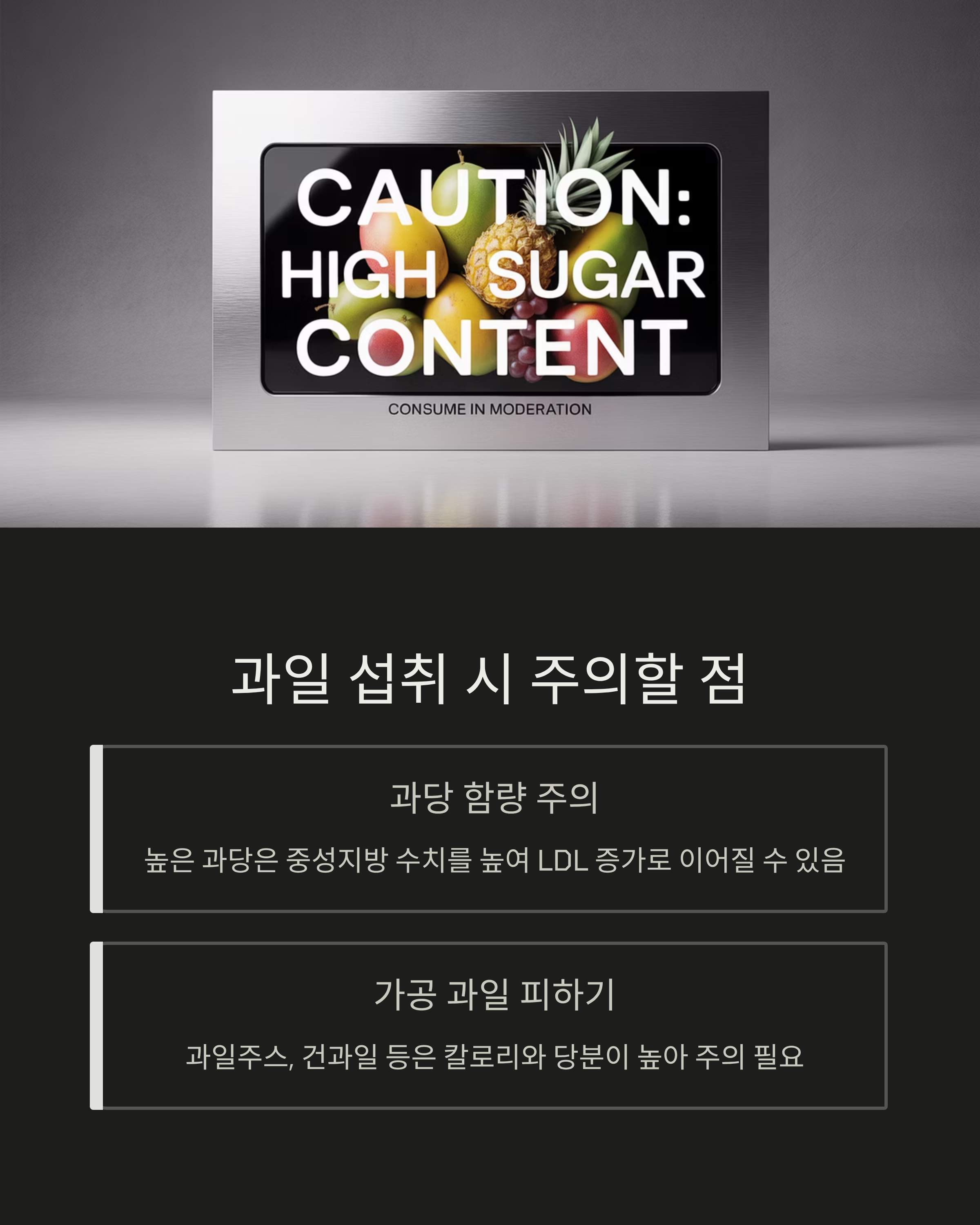 과당 함량이 높은 과일은 중성지방 수치를 높여 LDL 증가로 이어질 수 있습니다. 특히 가공된 과일주스, 건과일 등은 칼로리와 당분이 높아 주의해야 합니다.