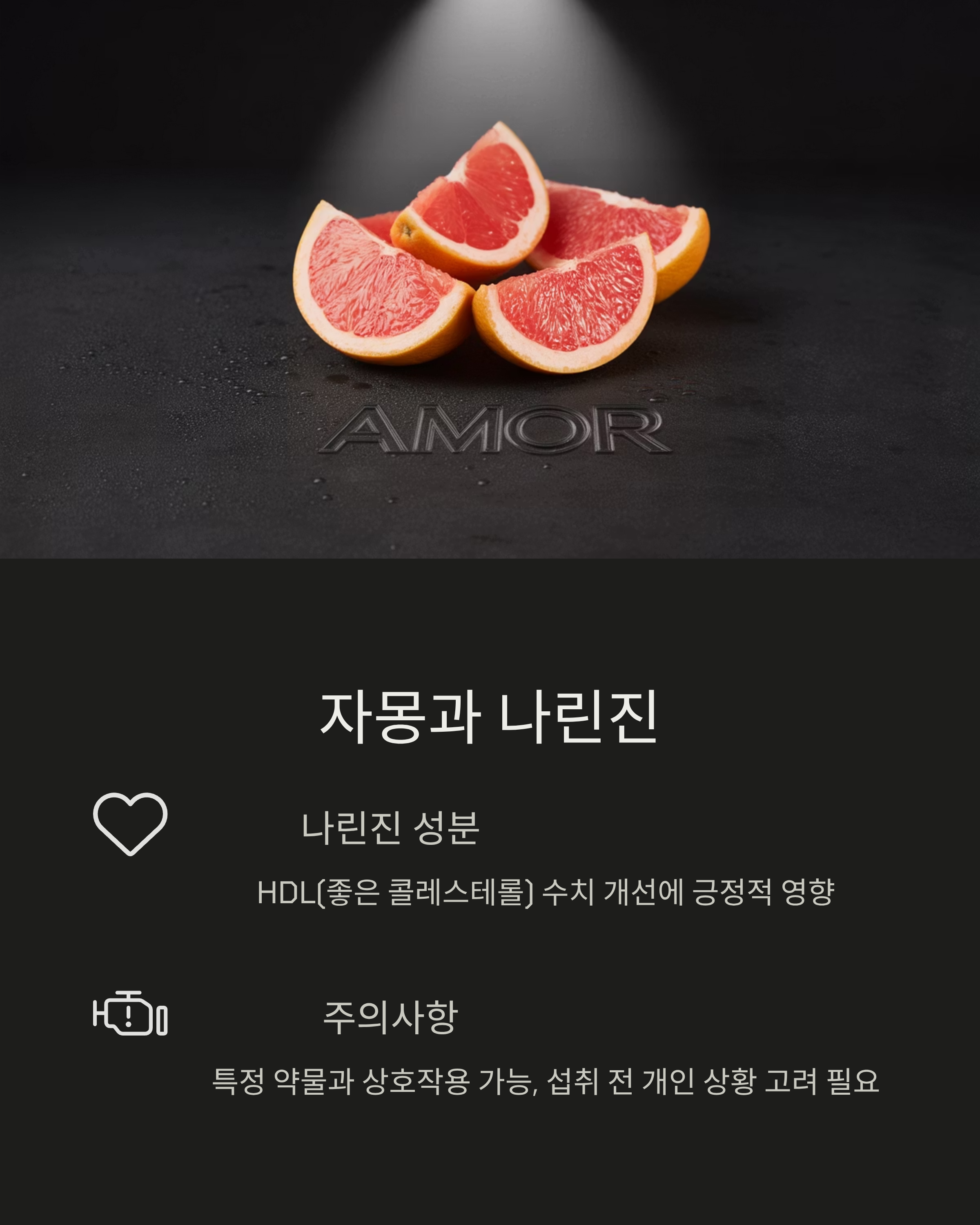 자몽에는 나린진이라는 성분과 플라보노이드가 들어 있어 HDL, 즉 좋은 콜레스테롤 수치 개선에 긍정적인 영향을 줍니다. 다만 특정 약물과 상호작용이 있을 수 있어 섭취 전 개인 상황을 고려해야 합니다.