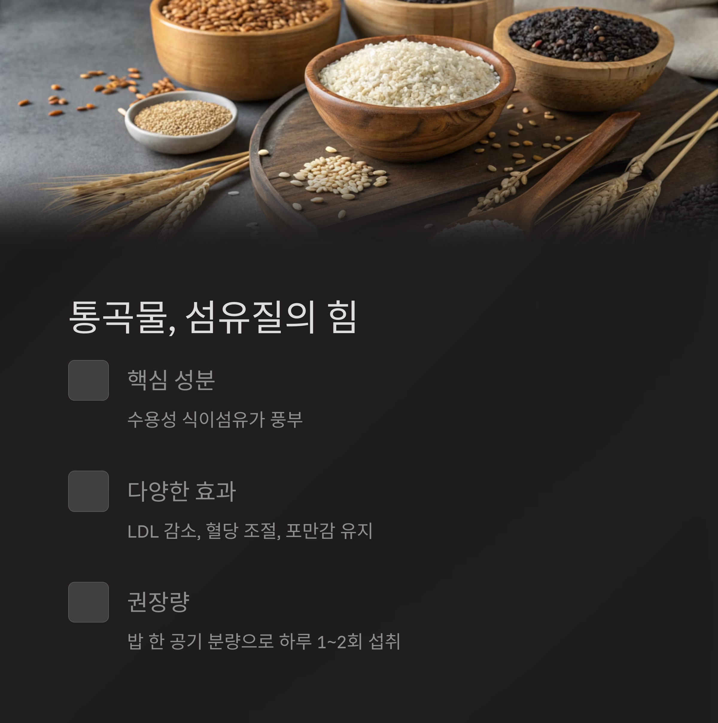 | 통곡물 | 수용성 식이섬유 | LDL↓, HDL↑ | 하루 1회에서 2회 |