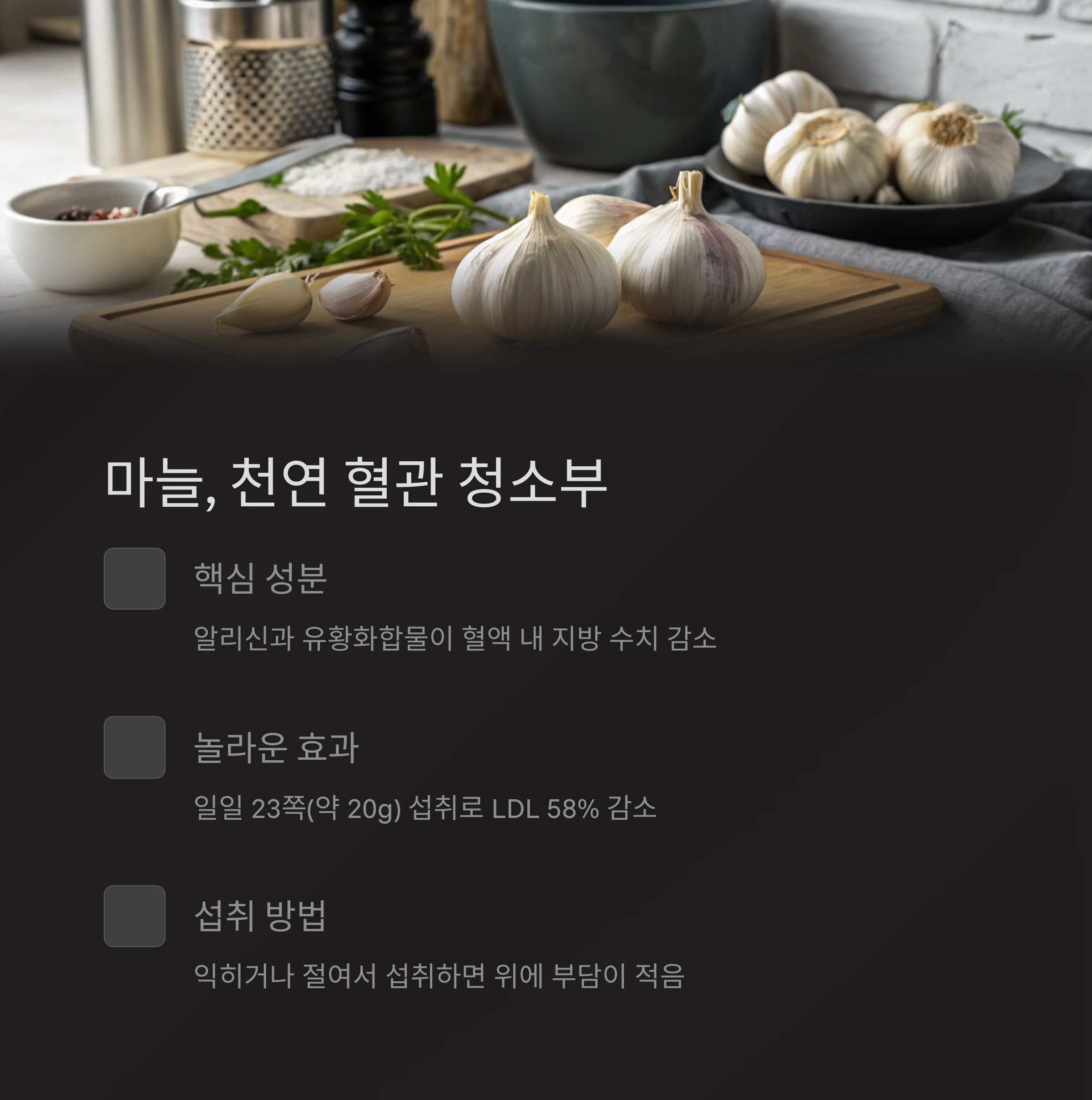 | 마늘 | 알리신, 유황화합물 | LDL 5%에서 8%↓, 중성지방↓ | 2쪽에서 3쪽(20g) |