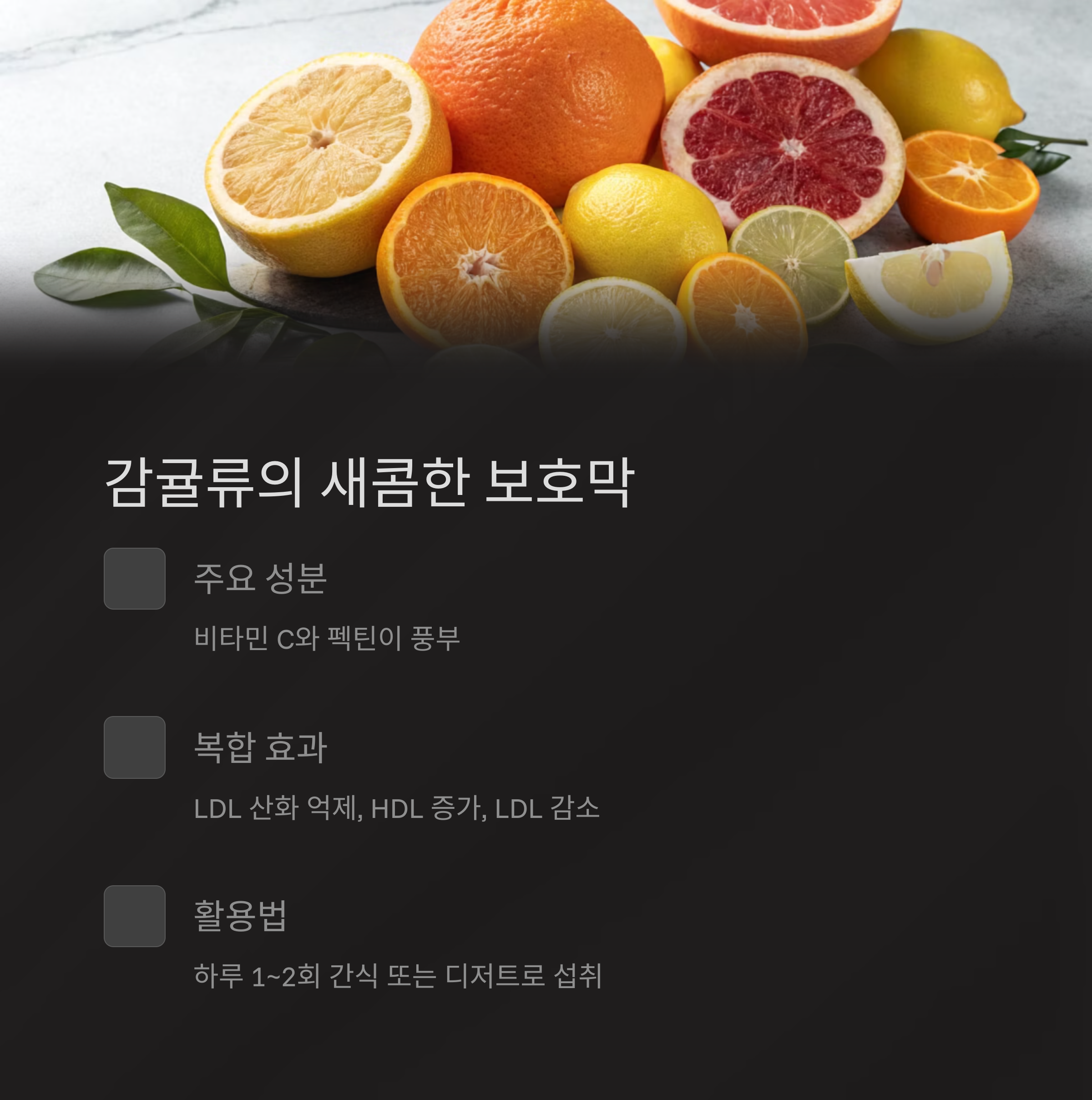 | 감귤류 | 펙틴, 비타민 C | LDL↓, HDL↑ | 하루 1회에서 2회 |
