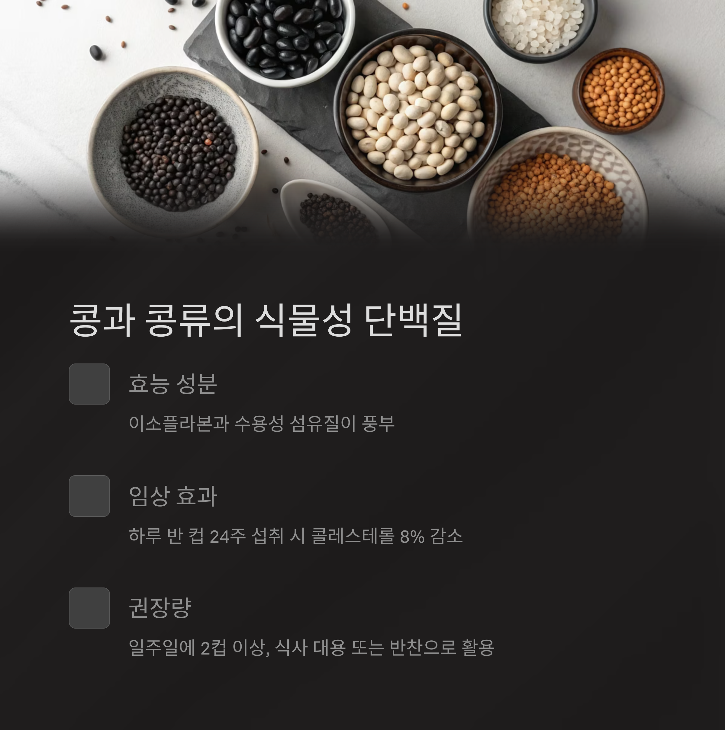 | 콩/콩류 | 단백질, 수용성 섬유질 | LDL 8%에서 10%↓ | 1컵(130g) |