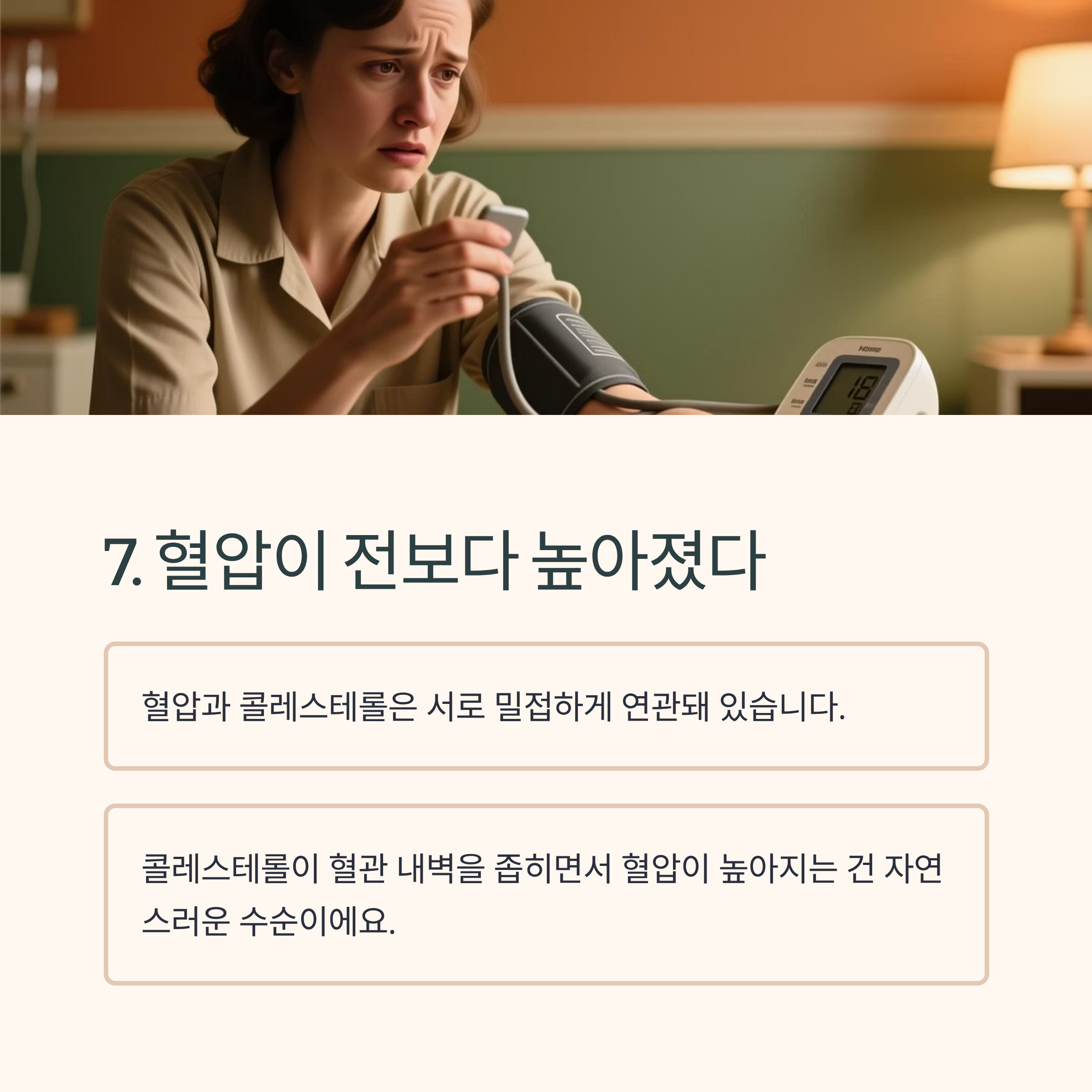 예전보다 혈압이 높아졌는데 특별한 이유가 없다면, 콜레스테롤 수치부터 확인해보는 게 좋습니다.