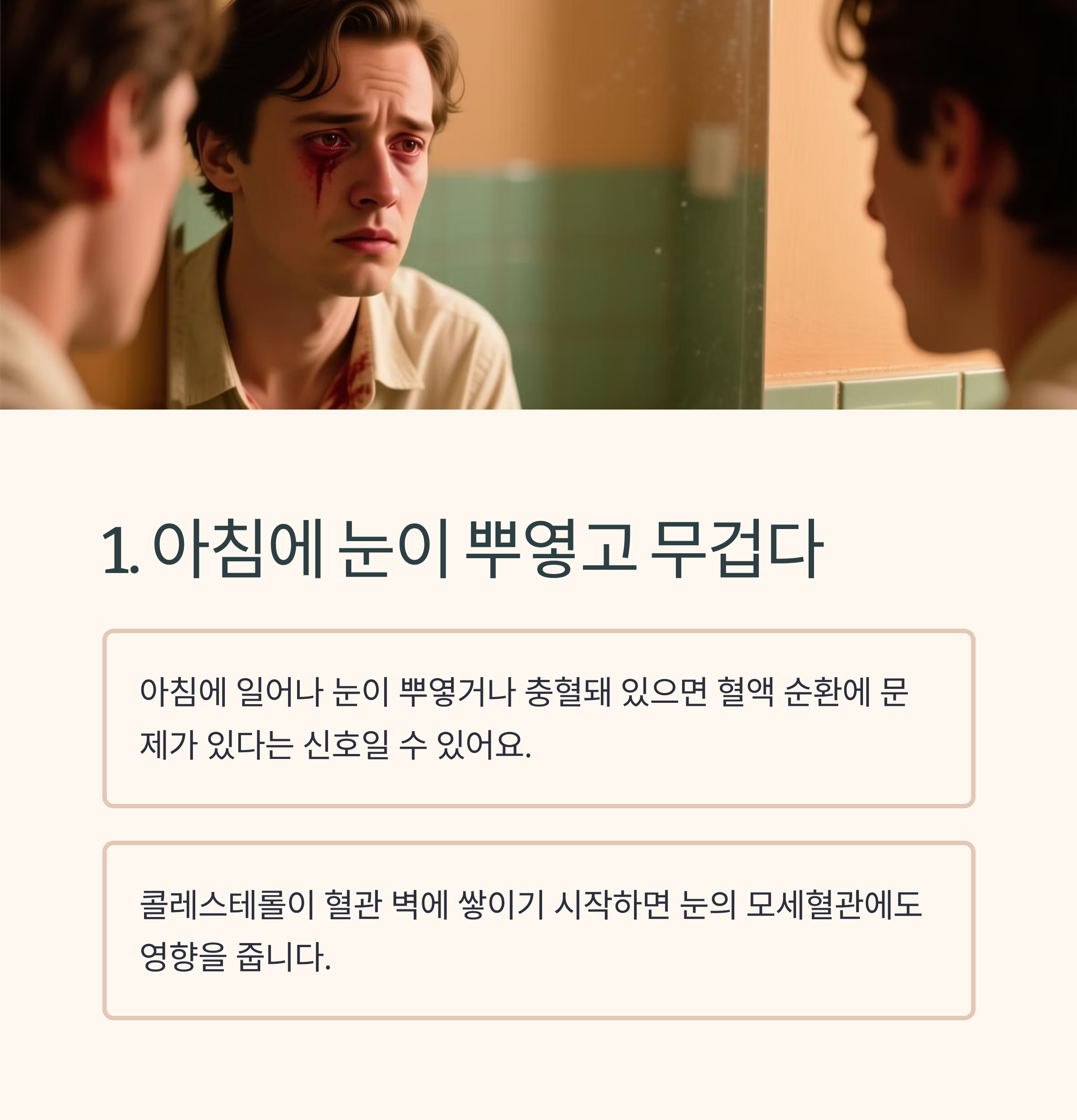 아침에 일어나 눈이 뿌옇거나 충혈돼 있으면 혈액 순환에 문제가 있다는 신호일 수 있어요. 특히 콜레스테롤이 혈관 벽에 쌓이기 시작하면 눈의 모세혈관에도 영향을 줍니다.