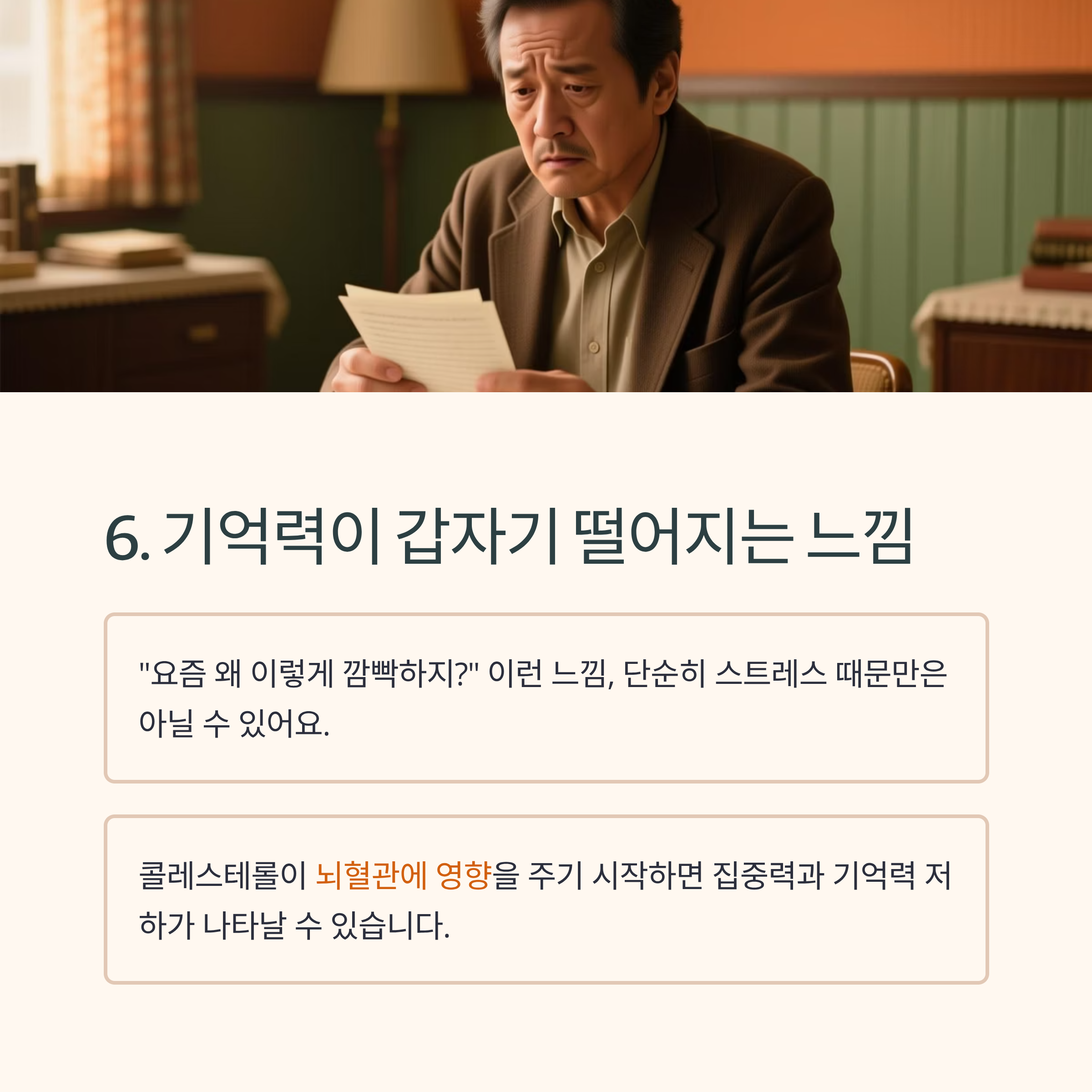 콜레스테롤이 뇌혈관에 영향을 주기 시작하면 집중력과 기억력 저하가 나타날 수 있거든요.