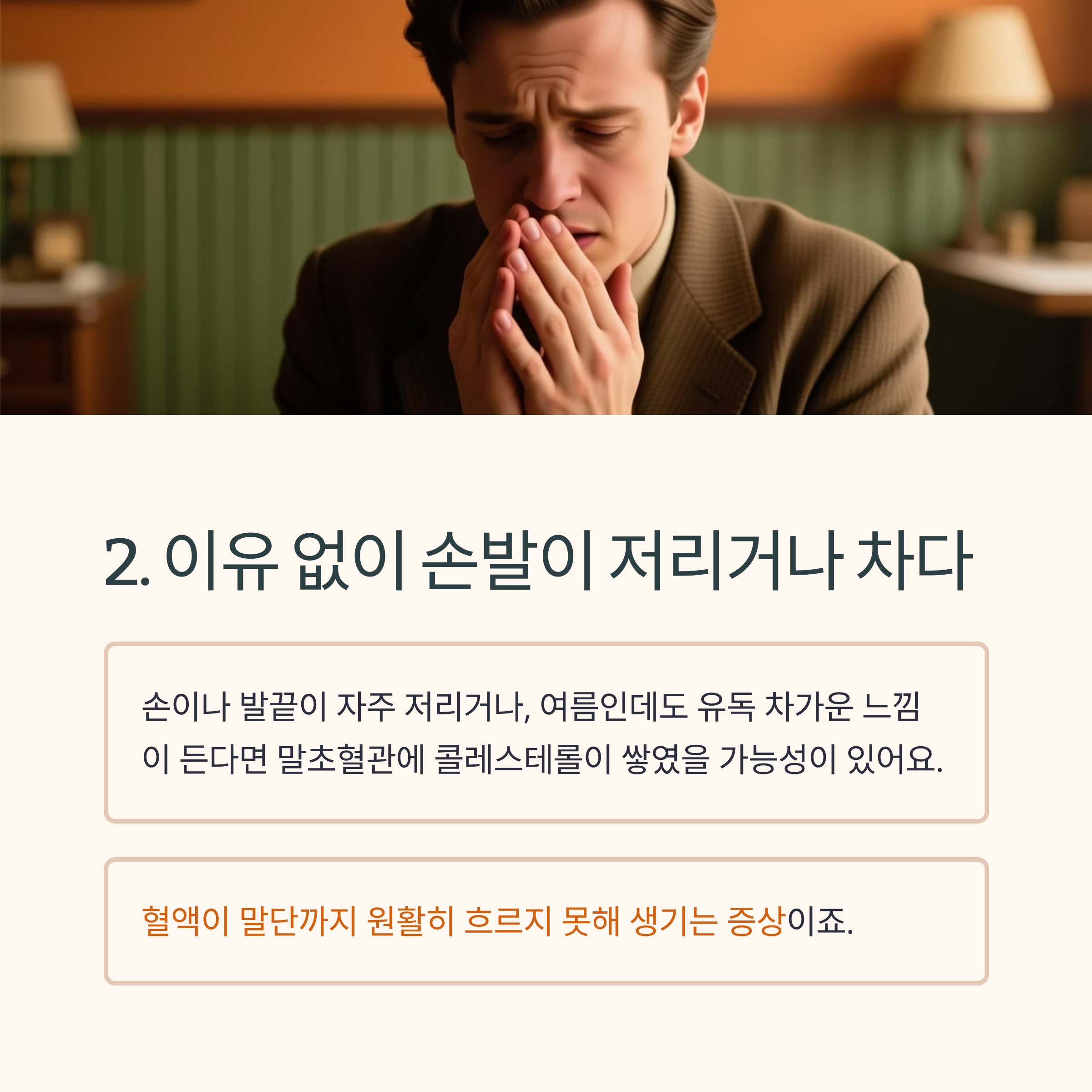 손이나 발끝이 자주 저리거나, 여름인데도 유독 차가운 느낌이 든다면 말초혈관에 콜레스테롤이 쌓였을 가능성이 있어요.